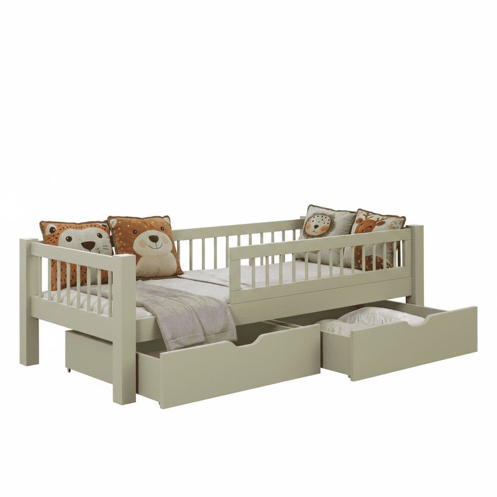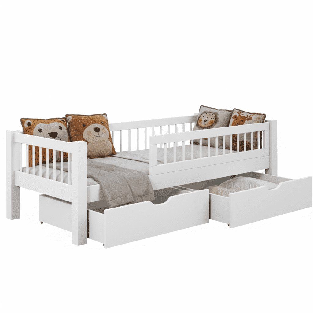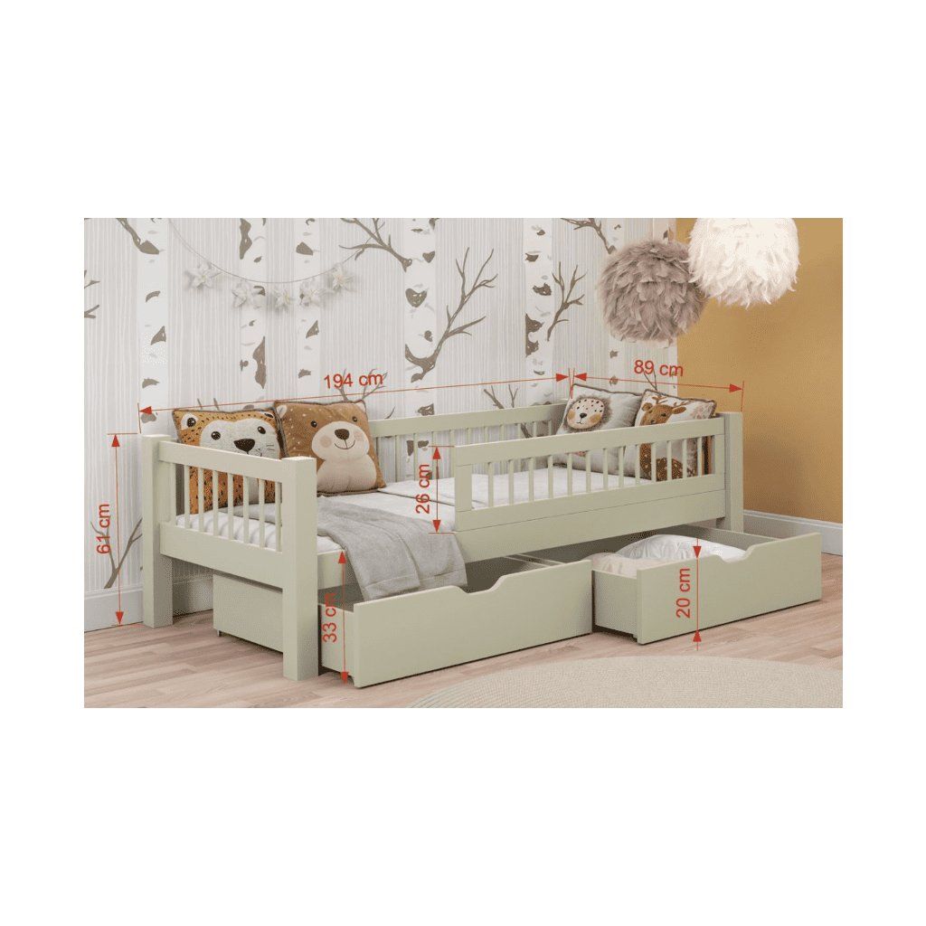 Olyan ágyat keresel, ami a kényelmes alvást praktikus tárolóhellyel ötvözi? Az ADEL fiókos gyerekágy ideális választás azoknak a szülőknek, akik rendben szeretnék tartani gyerekszobájukat, ugyanakkor biztonságos és kényelmes helyet szeretnének biztosítani gyermeküknek a pihenésre. Egyszerű és időtlen kialakításának köszönhetően az ágy bármilyen gyerekszobába illik - akár modern, skandináv vagy játékos módon rendezed be. A fehér és fenyőfa dizájn optikailag megnöveli a teret, és letisztult, friss benyomást kelt. A zöld ágy ezzel szemben dizájner megjelenésű. Az ágy nagy előnye a tágas kihúzható fiókok , amelyek elegendő helyet biztosítanak ágynemű, játékok vagy szezonális ruhák tárolására. Így minden szépen el lesz rendezve, és mindig kéznél lesz. Az ágyhoz tartozik egy léces ágyrács, matrac pedig külön rendelhető .