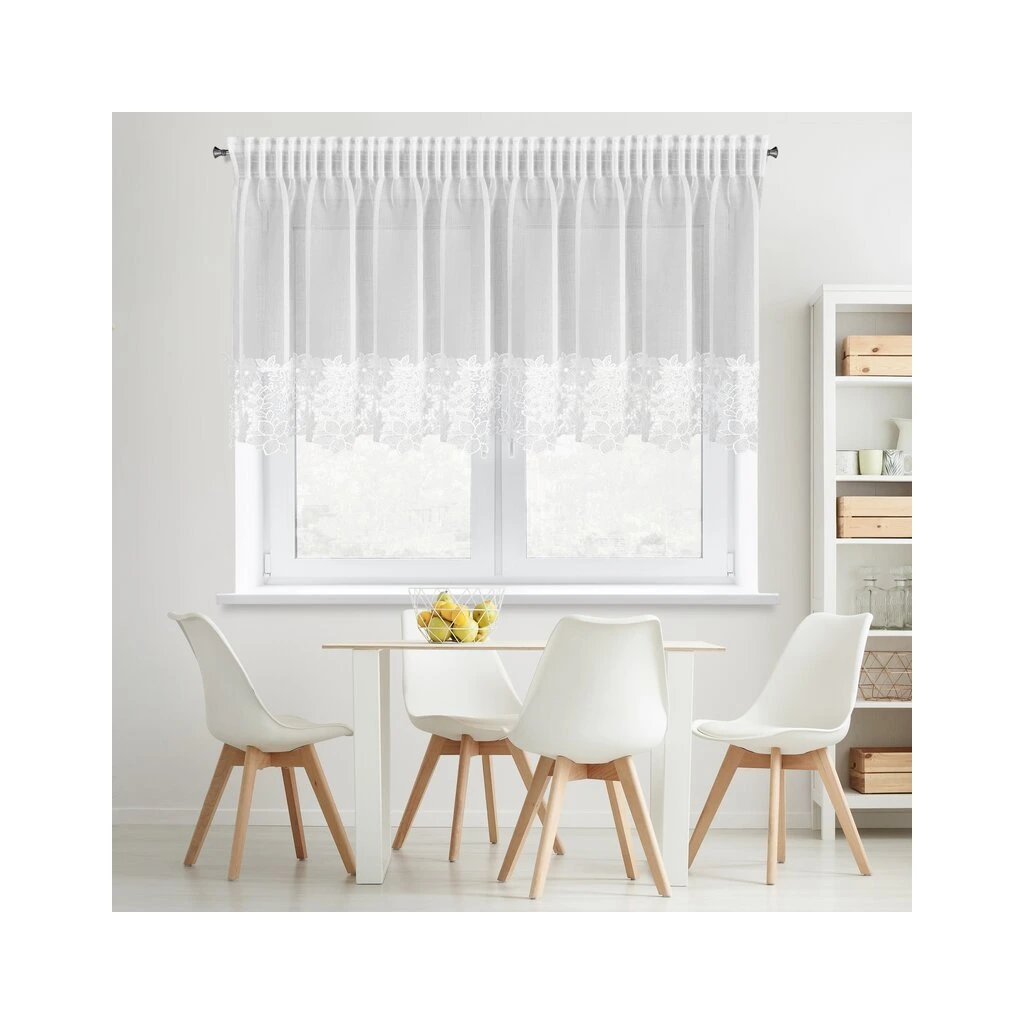 Rövid függöny virágmintás díszítéssel. Szélesség: 200 cm, Hosszúság: 70 cm, Szín: Fehér, Súly: 70 GSM, Összetétel: Anyag: 100% poliészter