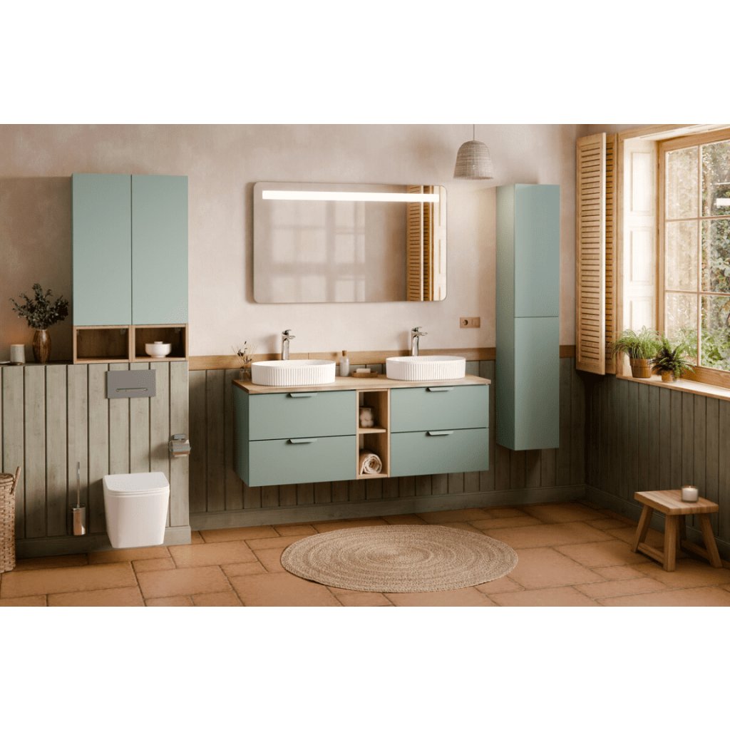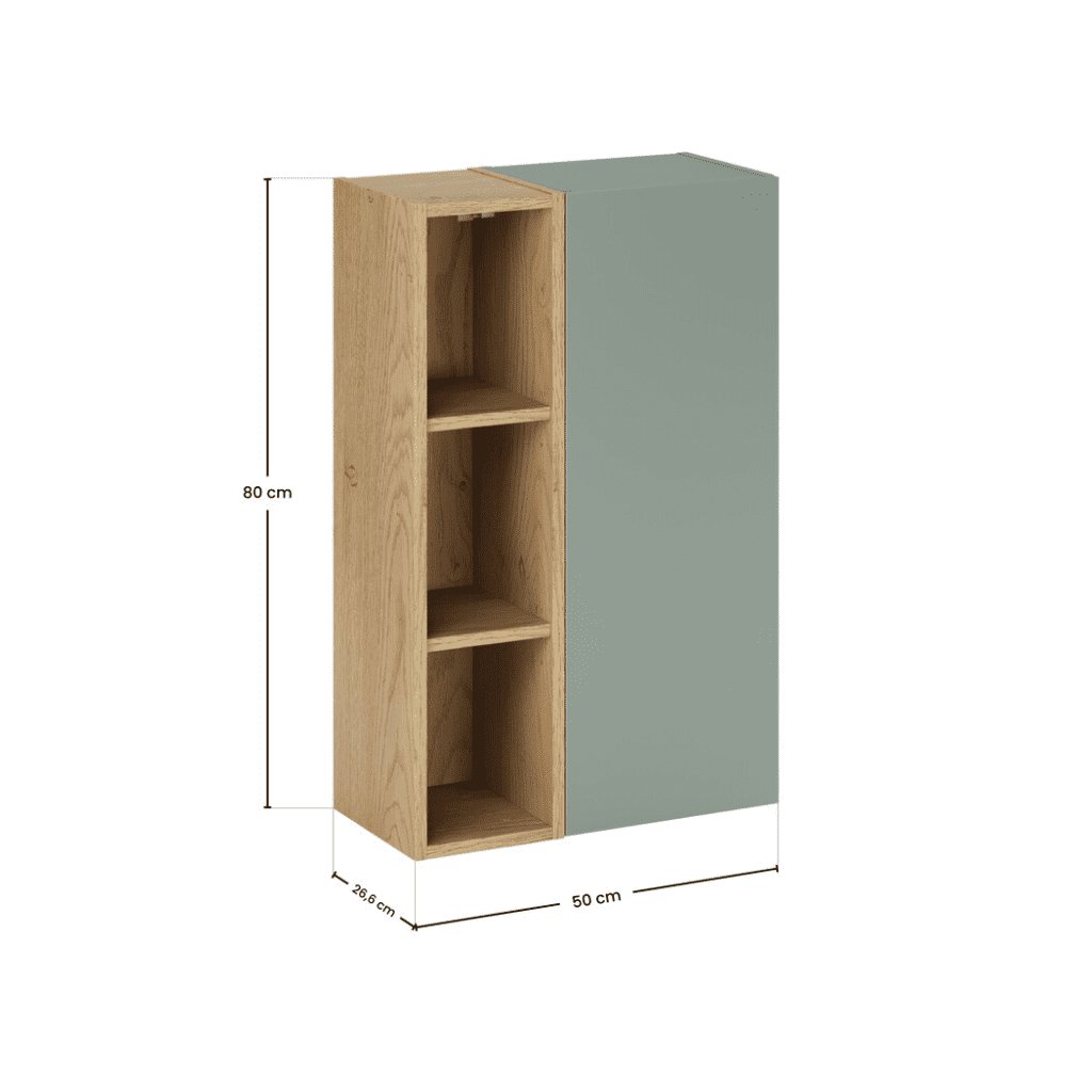 Hatékonyan szeretné kihasználni fürdőszobája szűk terét? A keskeny ASTER Green 20×80-as faliszekrény nyitott polcokkal ideális kiegészítője lehet egy fürdőszobabútor-garnitúrának, praktikus tárolóhelyet kínálva anélkül, hogy nehézkesnek tűnne. A zöld váz és a natúr fa dekoráció kombinációja modern és kellemes kontrasztot teremt. A nyitott polcok ideálisak kozmetikumok, törölközők, dekorációk vagy olyan mindennapi tárgyak tárolására, amelyeket mindig kéznél szeretne tartani. Karcsú, mindössze 50 cm széles kialakításának köszönhetően a szekrény kisebb fürdőszobákba is alkalmas, egy mosdószekrény és egy magas szekrény közé, vagy különálló designelemként.