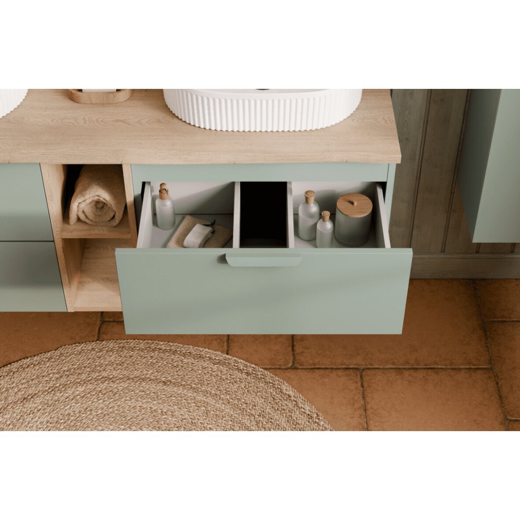 Az ASTER GREEN 82-60-46-2S fali mosdószekrény ideális megoldás a modern fürdőszobákba, amelyek a funkcionalitás, a minimalista dizájn és a finom színeleganciát keresik. A visszafogott zöld árnyalat nyugodt, időtlen hatású , és tökéletesen illik a fehér szaniterekhez és a természetes dekorációkhoz. A szekrény két tágas fiókkal rendelkezik, amelyek elegendő helyet kínálnak kozmetikumok, tisztítószerek és fürdőszobai kiegészítők tárolására. A fali kialakítás megkönnyíti a takarítást , és légies, modern megjelenést kölcsönöz a fürdőszobának.