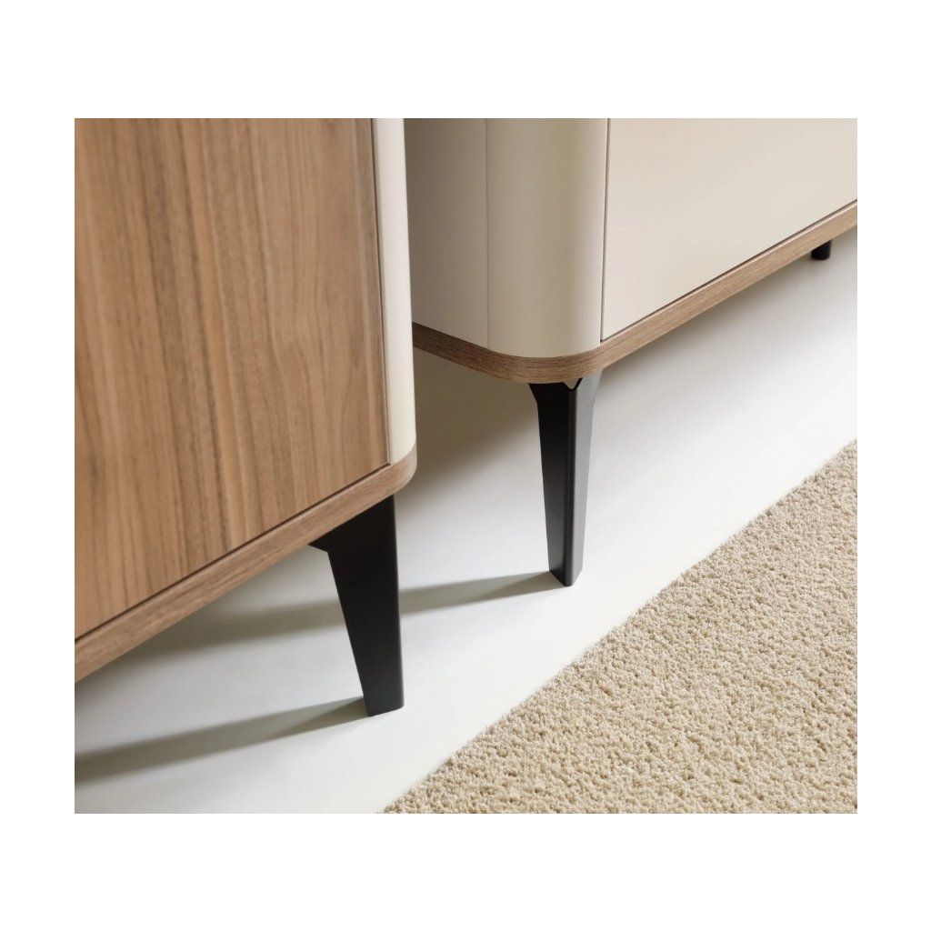 A bútor kiváló minőségű, 16 mm vastagságú laminált forgácslapból készült. A váz kasmír felületkezelésű, míg az ajtók és a teteje királyi dió színű, amely természetes fa megjelenést kölcsönöz nekik. Az egyes részek élei tartós ABS éllel vannak ellátva , amely megvédi az anyagot a sérülésektől és a nedvességtől. A váz kasmír színű éllel van ellátva, míg az ajtók kasmír és királyi dió színűek kombinációja. A teteje vastagabb, királyi dió színű ABS éllel rendelkezik a nagyobb tartósság érdekében. A lábak fekete fémből készültek, ami biztosítja a teljes szerkezet stabilitását és szilárdságát . A fogantyúk műanyagból készültek , szintén fekete színben. Tisztításhoz puha, enyhén nedves ruhát használjon. Kerülje az agresszív tisztítószereket és a durva szivacsokat. Tisztítás után törölje szárazra a felületet.