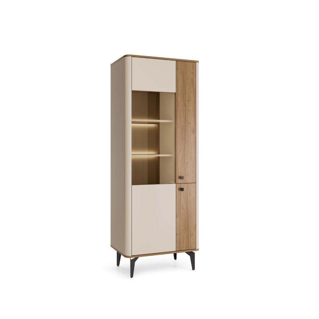 Az AUNERA AU2 vitrin egy modern bútordarab, amely az elegáns kasmír dekorációt ötvözi a jellegzetes királyi dió árnyalattal. A vitrin fekete fém lábakon áll. A lábak magassága 18 cm, ami légies és modern megjelenést kölcsönöz a bútornak , ugyanakkor megkönnyíti az alja tisztítását. Az ajtók zsanérokkal nyílnak, és csendes felülettel vannak ellátva , ami növeli a használat kényelmét. A bútort egyszerű, kerek, fekete műanyag fogantyúk egészítik ki, amelyek átmérője 2,8 cm. A vitrin három fiókos ajtóval rendelkezik, így megőrizve a modern enteriőrökbe illő letisztult és minimalista dizájnt .
