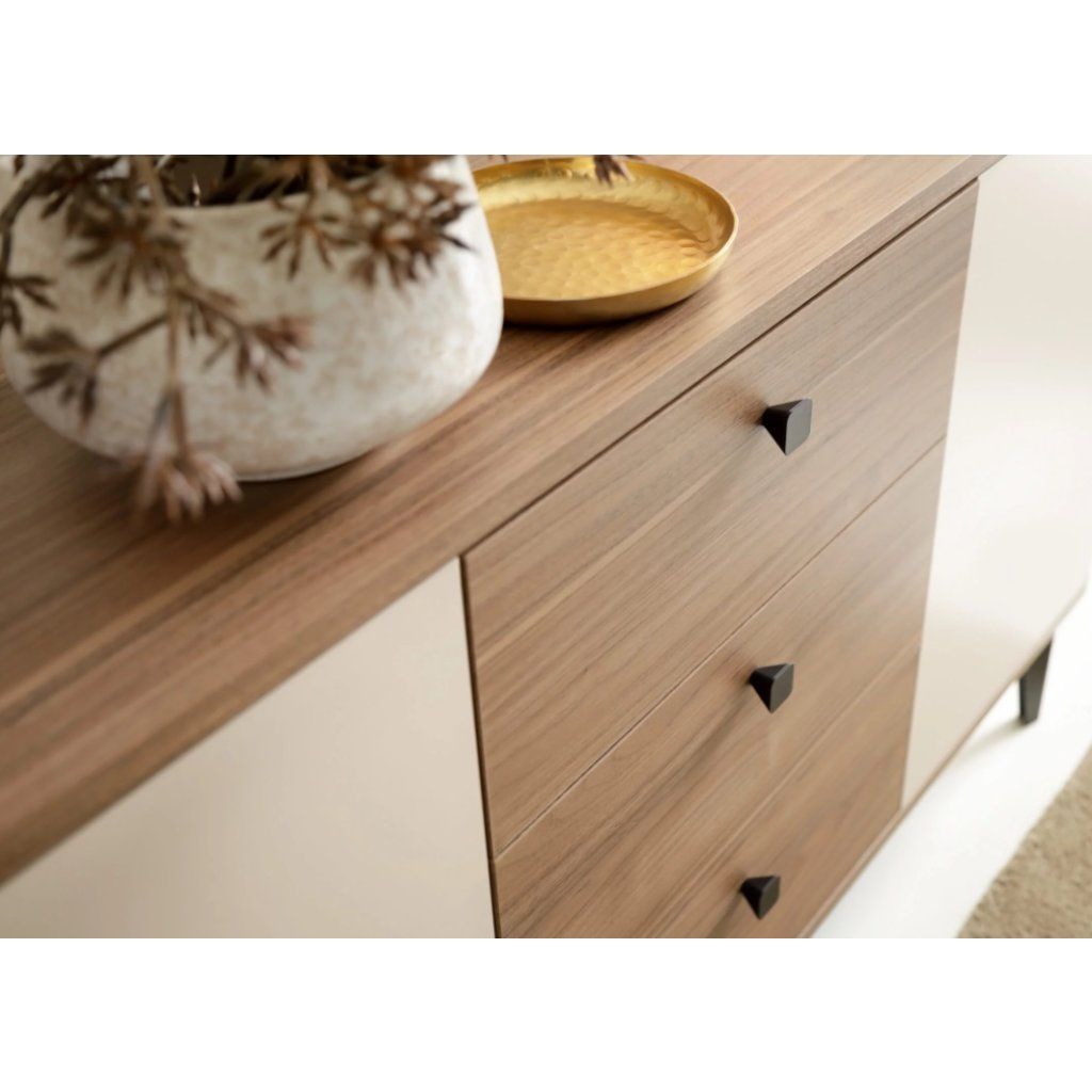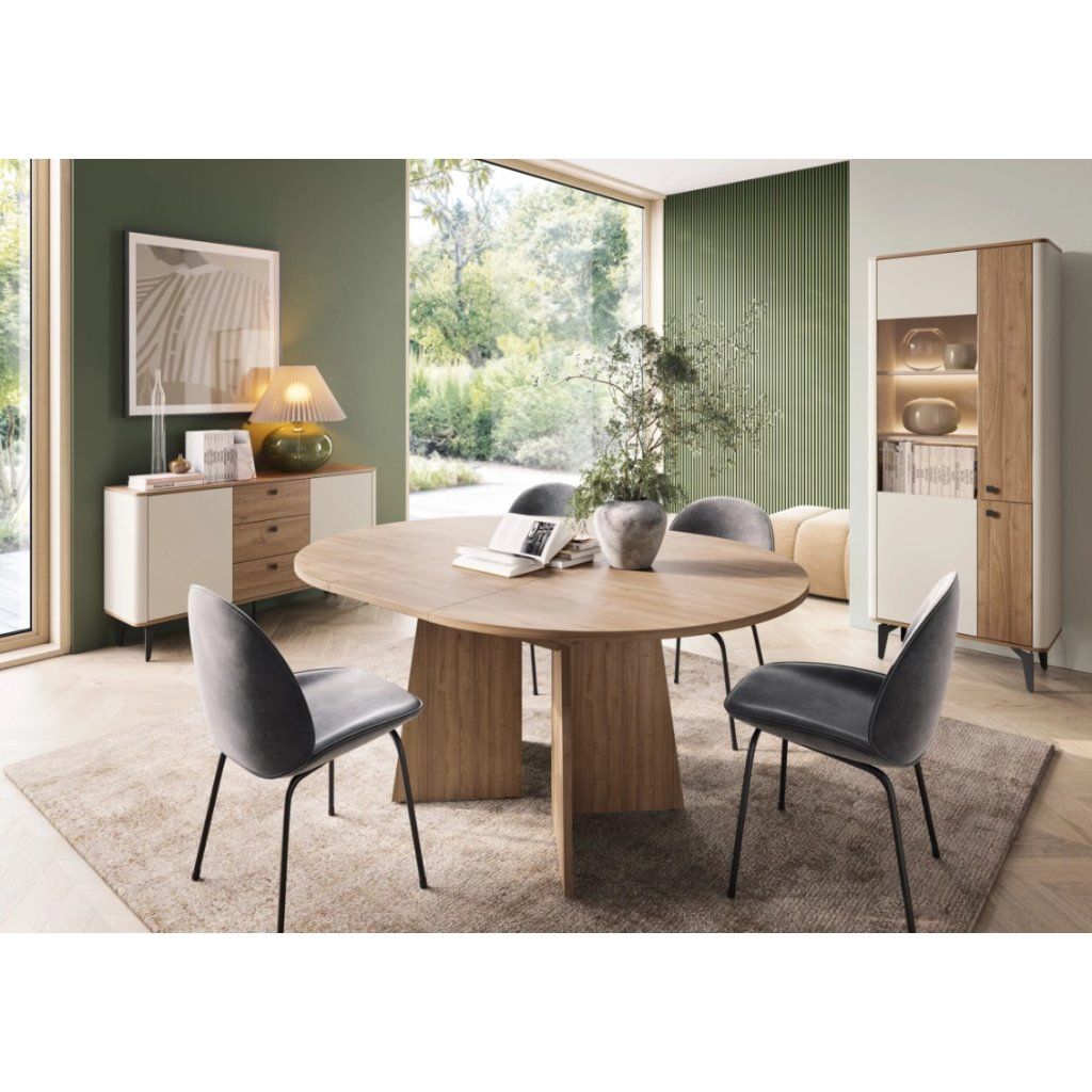 Az AUNERA étkezőasztal egy modern bútordarab, amely az elegáns kasmír dekorációt ötvözi a jellegzetes királyi dió árnyalattal. Az étkezőasztal fekete fém lábakon áll. A lábak magassága 18 cm, ami légies és modern megjelenést kölcsönöz a bútornak , ugyanakkor megkönnyíti az alja tisztítását. Az ajtók zsanérokkal nyílnak, és csendes felületkezeléssel vannak ellátva , ami növeli a használat kényelmét. A bútort egyszerű, kerek, fekete műanyag fogantyúk egészítik ki, amelyek átmérője 2,8 cm. A vitrinhez LED világítás rendelhető.