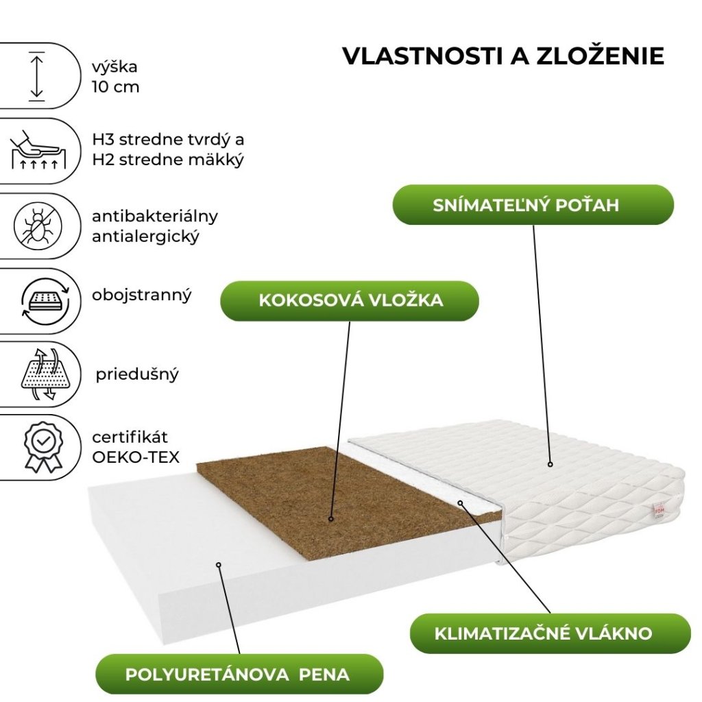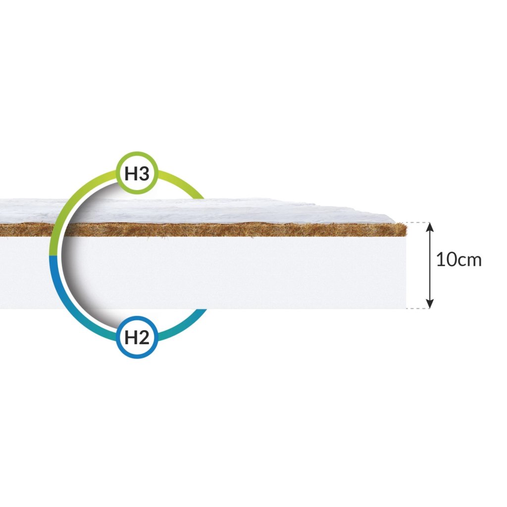 Baby Coco Max gyerek matrac minőségi anyagokból készült. A Baby Coco Max gyerekmatrac kétoldalas, H2 keménységű, ami közepesen puha matracot, és H3 keménységű, ami közepesen kemény matracot jelent. A huzat kiváló minőségű antiallergén anyagból készült, a huzat cipzáras, és 30°C-on mosógépben mosható. A kókuszrost matracok ellenállnak a nedvességnek és a deformációnak. Fektessen be a minőségbe , amely biztosítja gyermekeinek a nyugodt és egészséges alvást minden este.