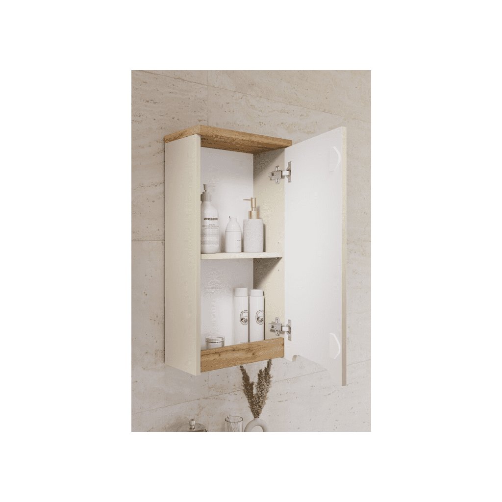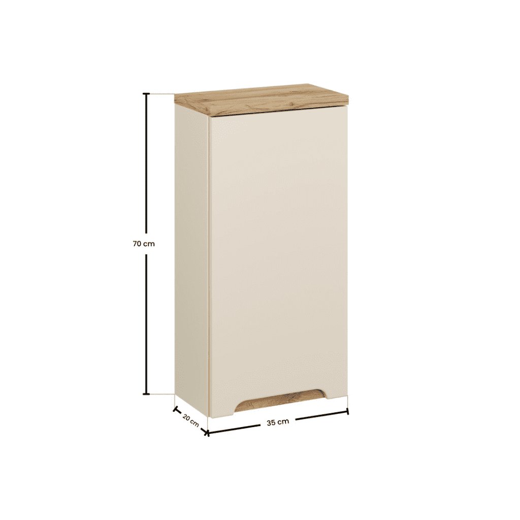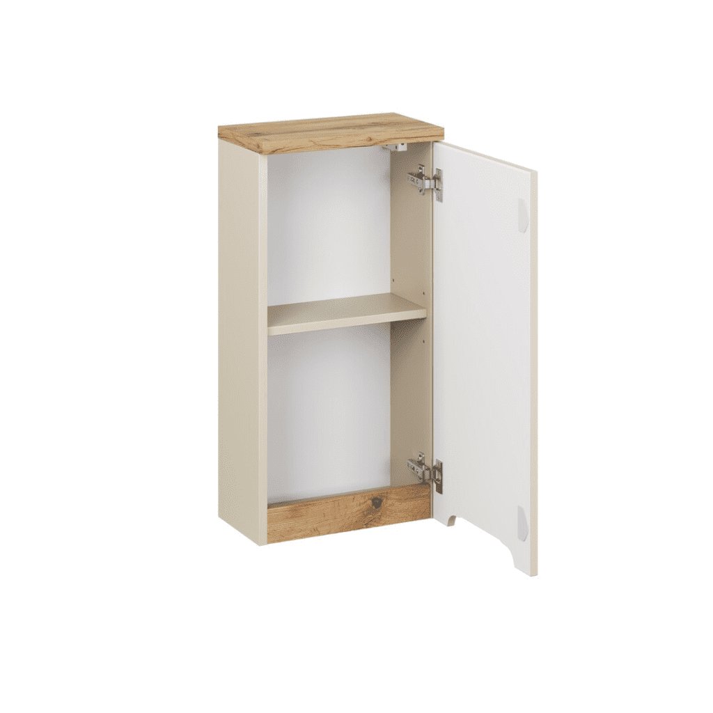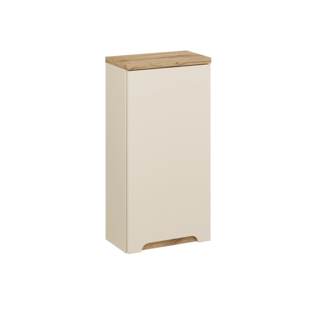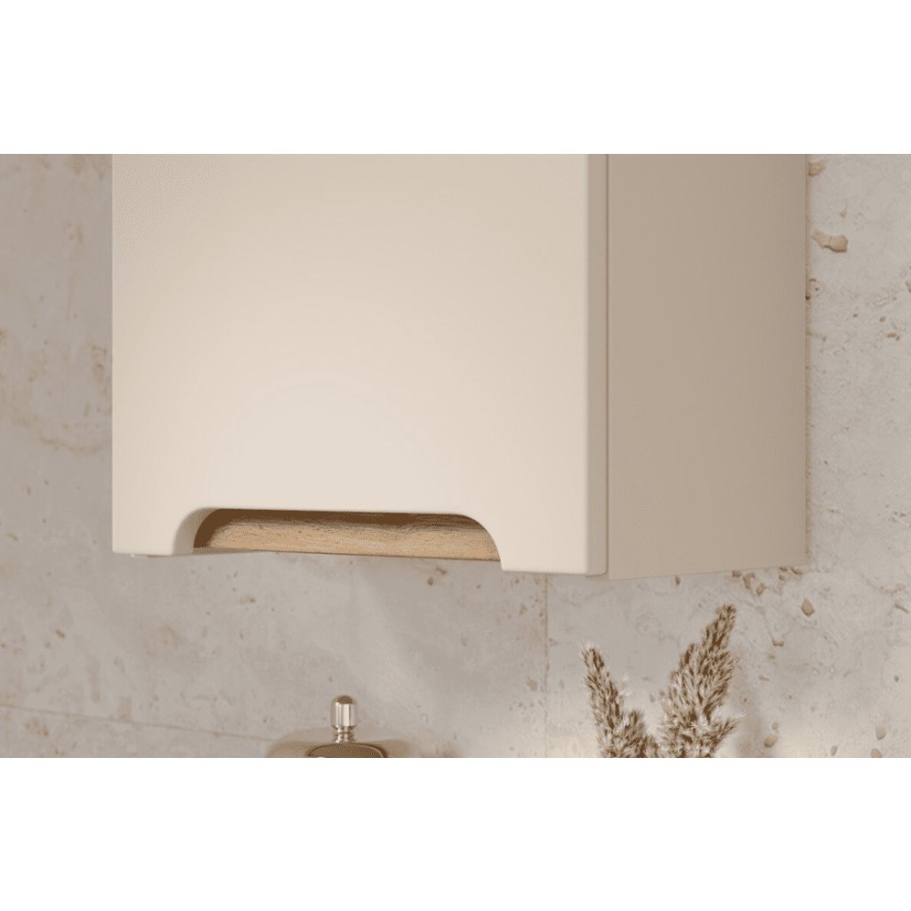 Teremtsen harmóniában teli fürdőszobát a BALI CASHMERE kollekcióval. A kasmír elegáns árnyalata gyönyörűen illeszkedik a természetes fa dekorációhoz , és puhaságot, melegséget kölcsönöz a belső térnek. A BALI Cashmere 830 fali fürdőszobaszekrény egy ajtóval és egy polccal rendelkezik. A kasmír és a meleg fa dekoráció kombinációja luxushatású. A BALI CASHMERE kollekció ideális választás azok számára, akik az esztétika, a kényelem és a praktikum kombinációját keresik.