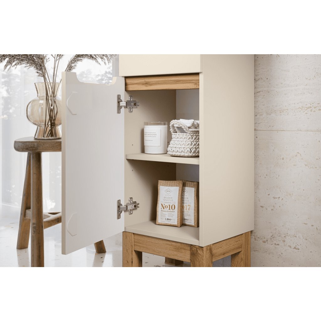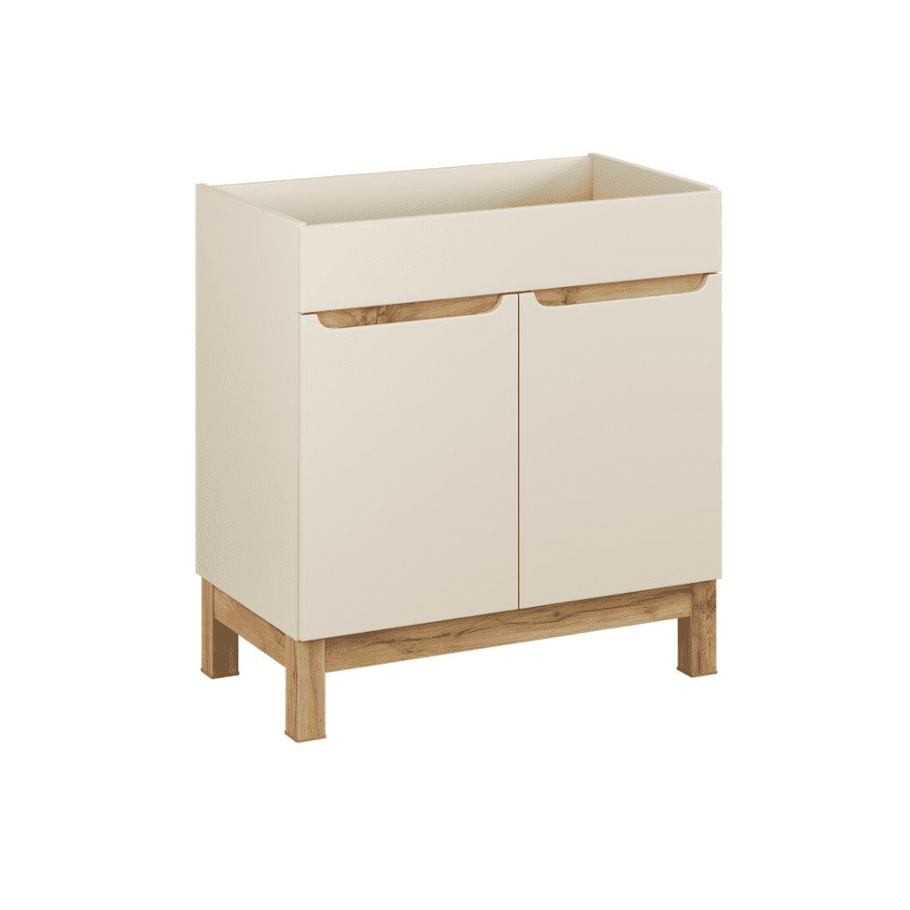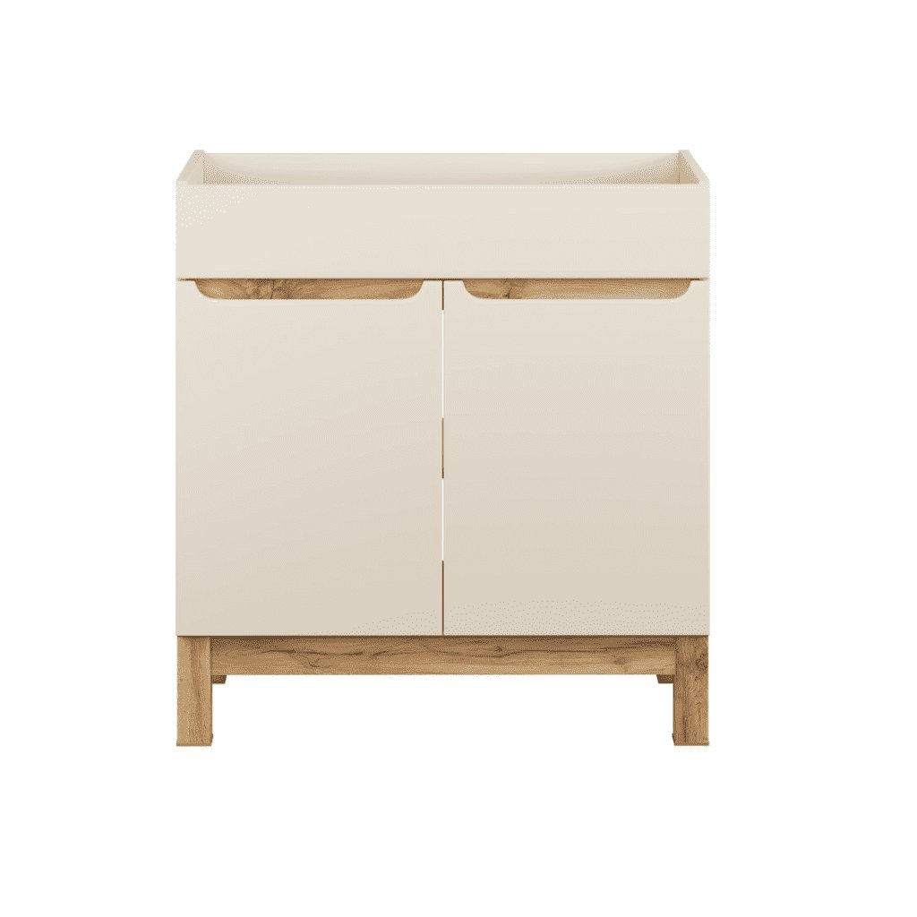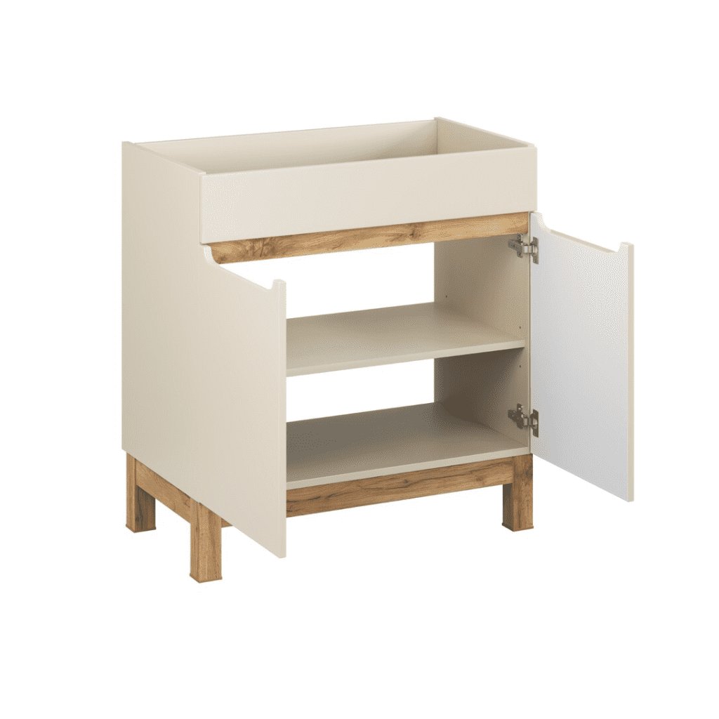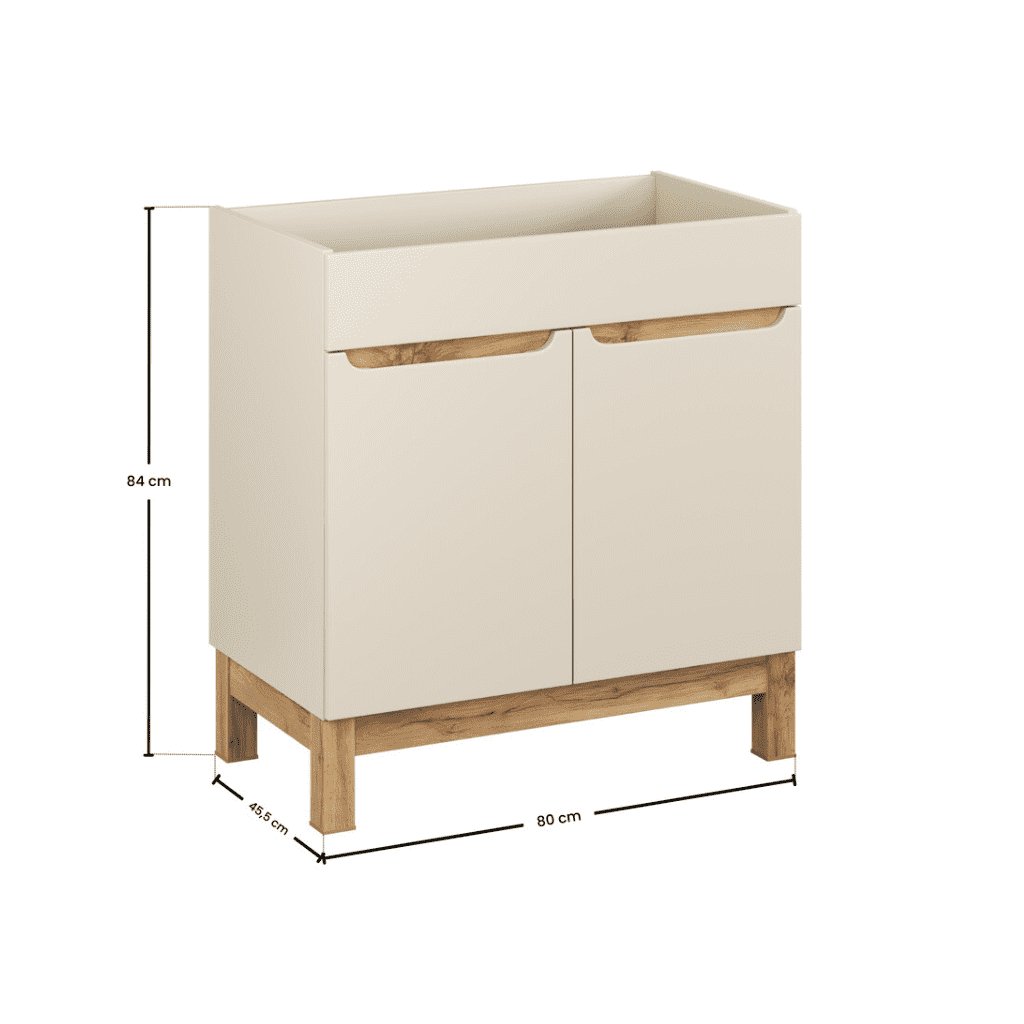 A BALI CASHMERE kollekcióval fürdőszobája olyan hellyé varázsolható, ahol a harmónia, a tisztaság és a természetes báj uralkodik. A praktikus , 80 cm széles BALI Cashmere 821 mosdó alá szerelhető fürdőszobaszekrény minden fürdőszobában megtalálja a helyét. A szekrény két ajtóval rendelkezik, amelyek mögött egy polc és rengeteg tárolóhely található. A modern dizájn és a kiváló minőségű anyagok garantálják az elégedettséget. A magas lábak megkönnyítik a fürdőszobai takarítást. A praktikus mosdó alatti munkalap tökéletesen kiegészíti a teljes szettet.