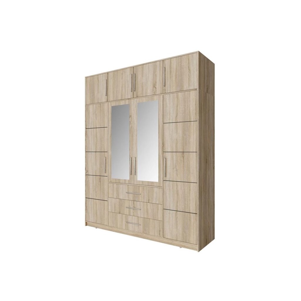 Elkészült a BALI gardrób kiváló minőségű laminált anyagokból 16 mm vastagsággal. Megvan tömör műanyag fogantyúk. ABS él növeli sérülésekkel szembeni ellenállás és megvédi a bútort a nagyobb mechanikai igénybevételtől. A tükrök az ajtóra vannak ragasztva.