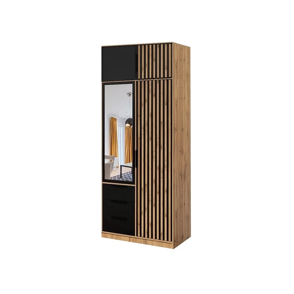 A tágas, bővíthető BALI LUX D2 gardrób kiváló választás minden olyan hálószobába, ahol sok tárolóhelyre van szükség. A szekrény népszerű dekorációval készült tölgy wotan kombinációban a lécek által különlegessé tett feketével ezek nagy sikerek. A BALI LUX D2 szekrény kétajtós és 3 fiókos.