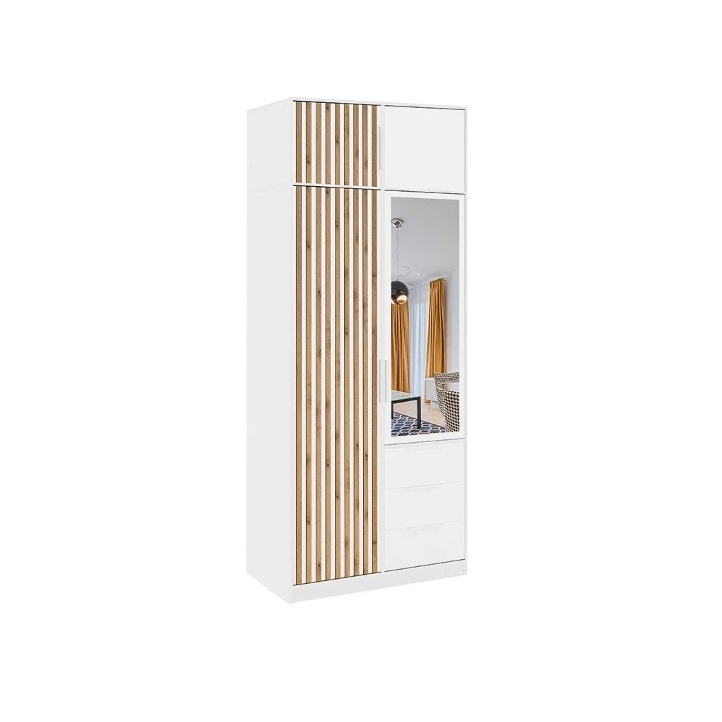 Eredeti kiegészítő a BALI LUX D2 gardróbszekrényhez gyönyörű fehér színben, Wotan tölgyfa lécekkel. A kiegészítő rengeteg tárolóhelyet kínál például szezonális ruháknak. A fogantyúk fehérek.