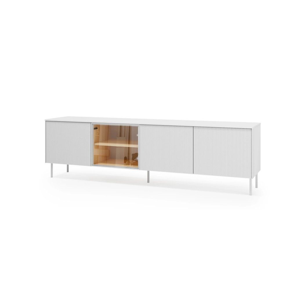 A BALIO LB-05A fehér színű, LED-es világítású, lábakon álló TV-állvány a modern dizájnt ötvözi a praktikus használattal. Letisztult szettainak, világos színének és finoman megmunkált előlapjának köszönhetően elegánsnak és légiesnek tűnik még kisebb helyiségekben is. Az alumínium kerettel ellátott központi üveg rész ideális dekorációk kiállítására, míg az integrált LED-világítás kellemes hangulatot teremt . A TV-állvány rengeteg tárolóhelyet kínál, a fogantyú nélküli, nyomásra nyitható rendszer pedig kényelmes használatot biztosít. A fém lábak könnyedséget kölcsönöznek a bútornak és megkönnyítik a tisztítást.