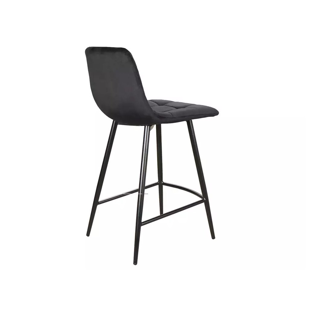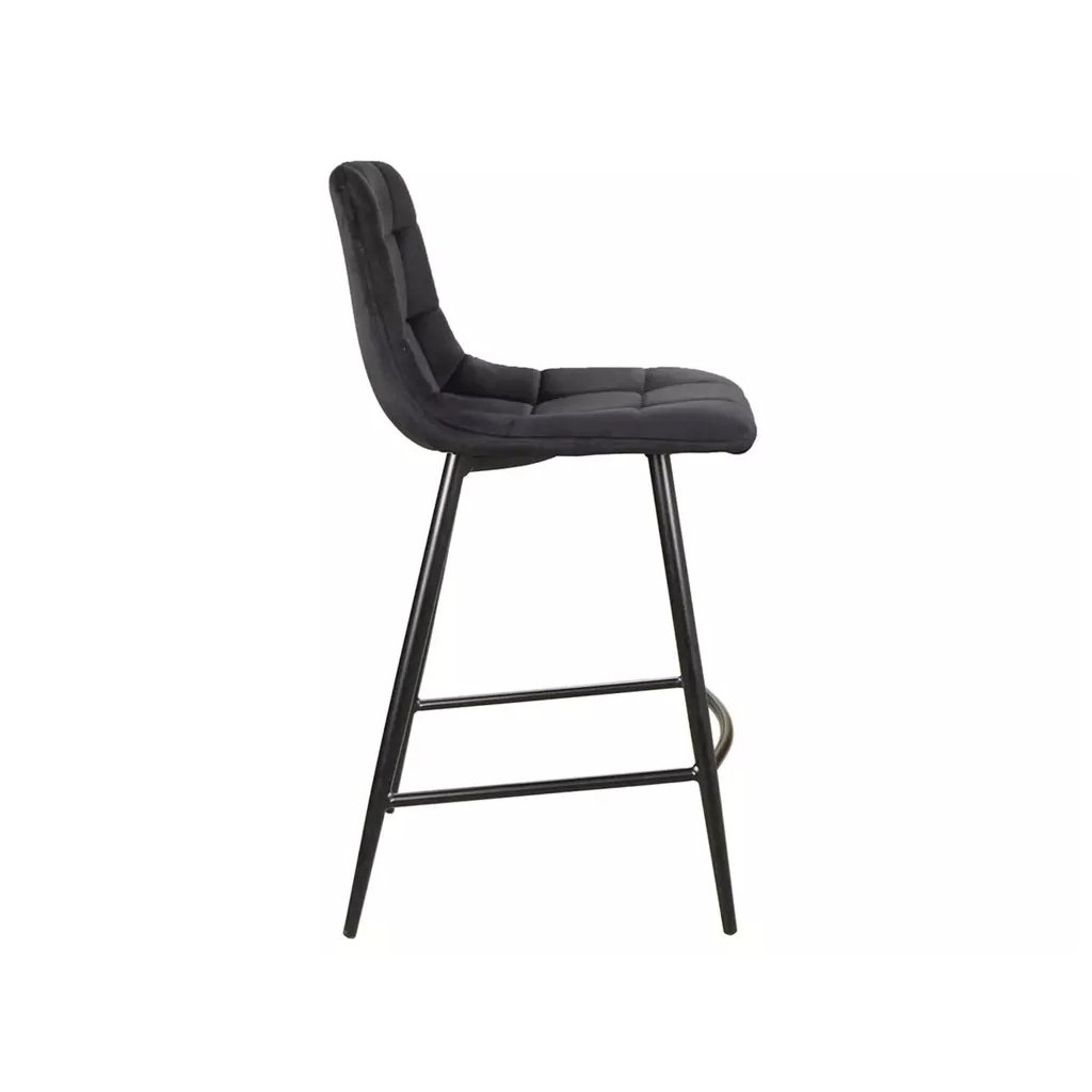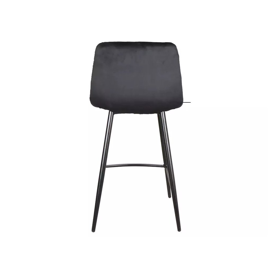 Modern bárszék MILA H-2 Velvet időtlen fekete kivitelben. A kárpitozott ülés fekete fém lábakkal kombinálva a bárszéket elegáns és vonzó bútordarabká varázsolja.