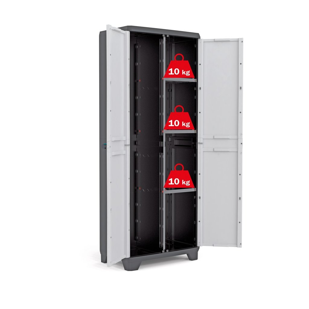 A BASEGAR UTILITY szekrényt úgy tervezték, hogy kiváló minőségű műanyagból készült , így nem kell foglalkoznia a korrózióval kapcsolatos problémákkal. A fő előnyök közé tartozik kiváló minőségű zsanérok , amelyek biztosítják a tartósságot Nyitási funkcionalitás és szilárd ajtózárás . A szekrény szilárdan áll a lábain.