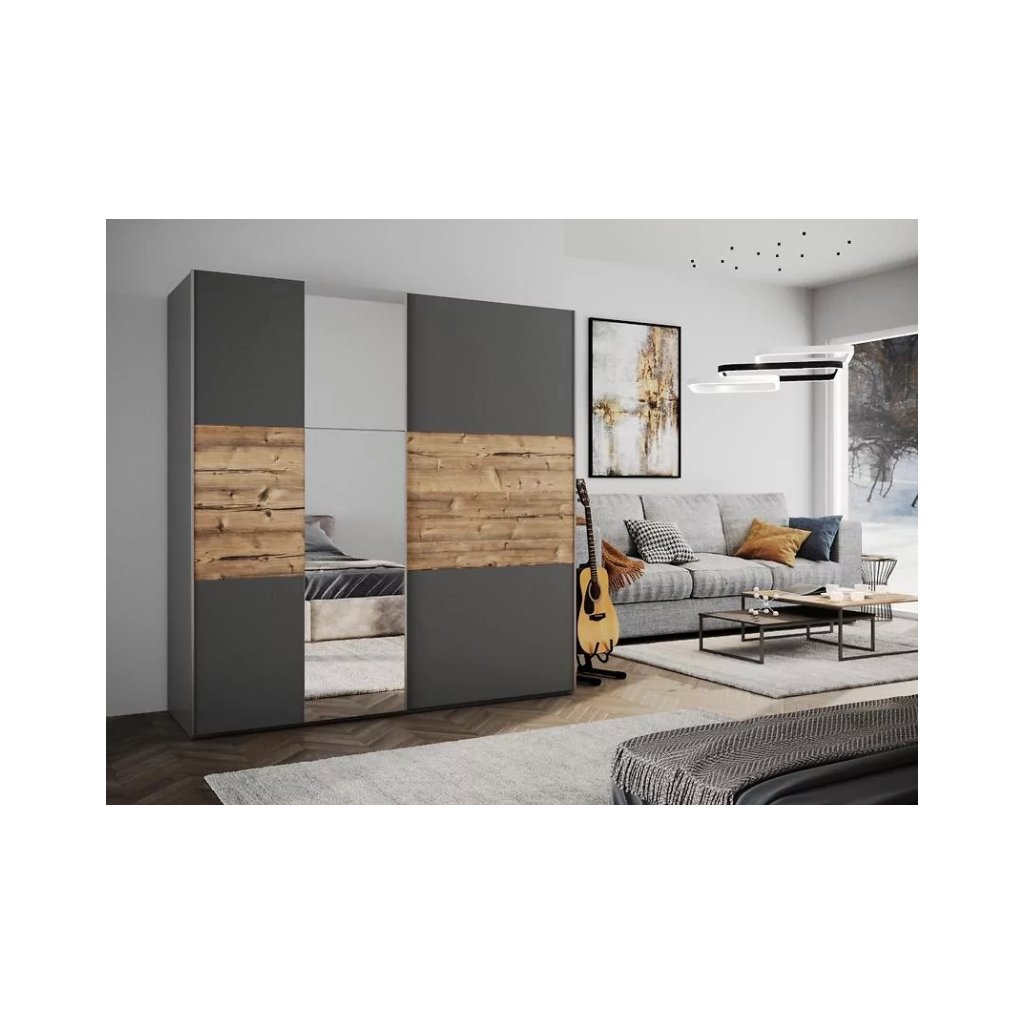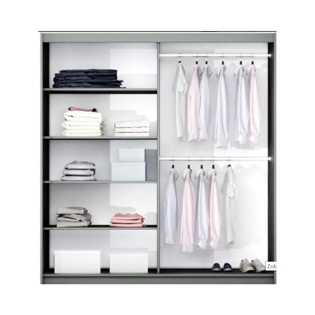 Gardrób A BASTIA-nak van Az alumínium sínek megkönnyítik a mindennapi használatot. A szekrény rendelkezik Kiváló minőségű szerelvények . A tükör a szekrényajtókra van ragasztva. Az ajtók oldalán védőcsíkok találhatók tömítésekkel (kefés felületű).