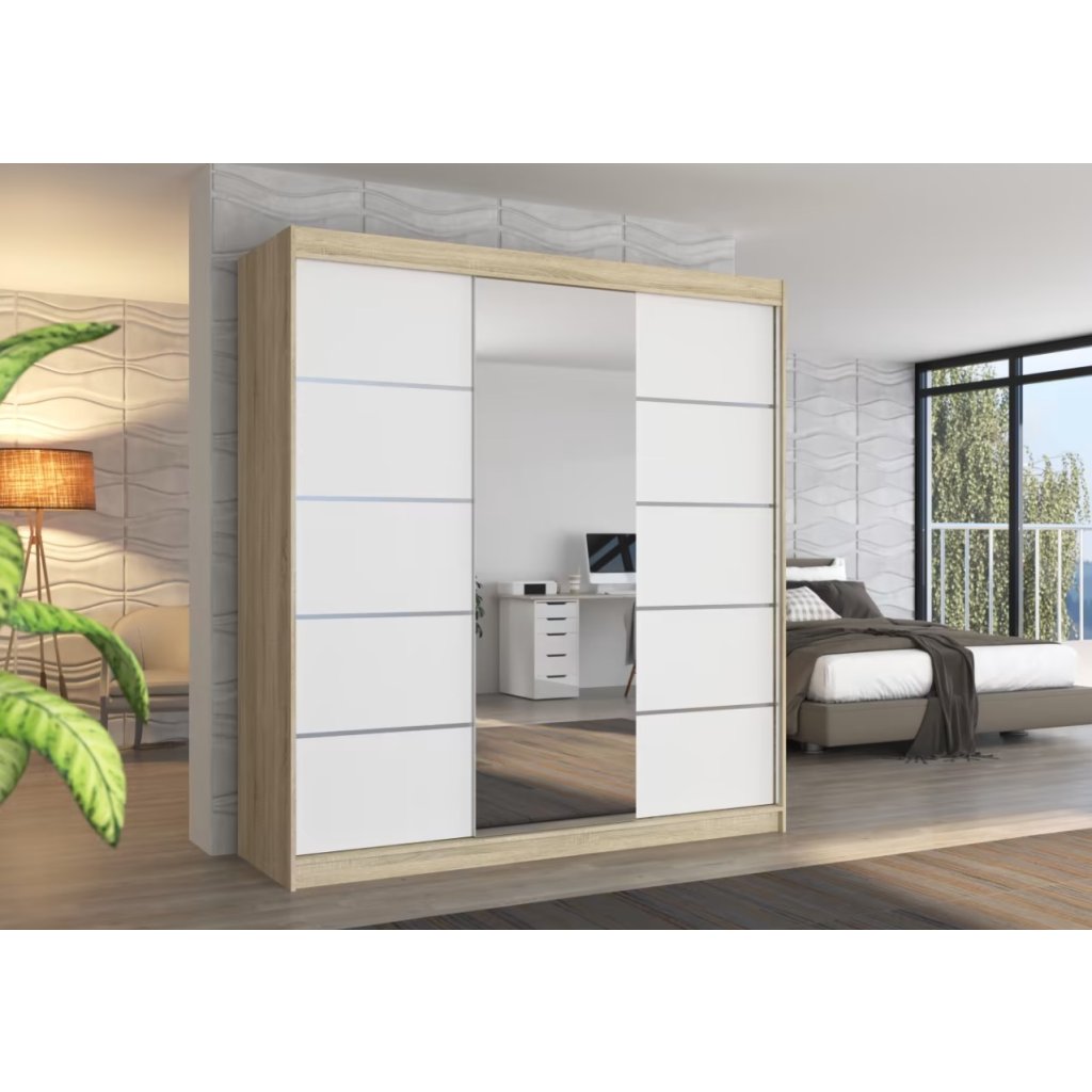 A 200 cm-es BERGEN tolóajtós szekrény ideális megoldás a hatékony térszervezéshez . A szekrény a legkeresettebb sonoma tölgyfából készült, fehér színkombinációval, amely könnyen kombinálható. Tágas polcokkal és ruhák, kosztümök, kabátok vagy ingek felakasztására szolgáló rúddal van felszerelve. A szekrény elejét tükör és díszes vízszintes csíkok egészítik ki, amelyek eredeti és modern megjelenést kölcsönöznek neki. A tolóajtós rendszer kisebb szobákba vagy keskeny folyosókra alkalmas.