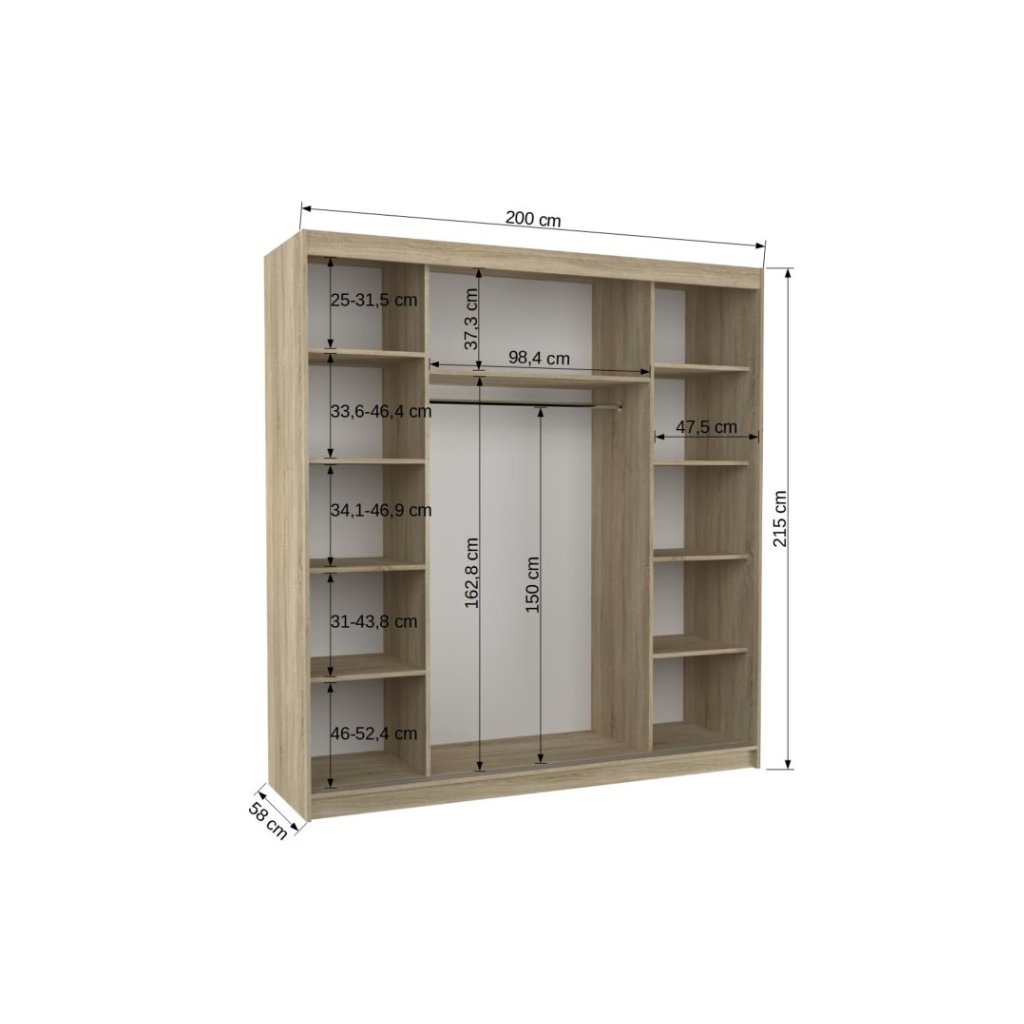 A BERGEN ruhásszekrény | sonoma tölgy/fehér 200 cm kiváló minőségű anyagokból készült, 16 mm vastagságban. ABS éllel rendelkezik, amely ellenállóbb a sérülésekkel szemben. Ez a modern ruhásszekrény fogantyú nélküli tolóajtós rendszerrel van felszerelve. Az alumínium tolóajtós rendszer biztosítja a sima működést . Szétszerelt állapotban szállítjuk, minden szükséges alkatrésszel és összeszerelési útmutatóval. Karbantartása egyszerű - csak használjon nedves ruhát vagy bútortisztítót.