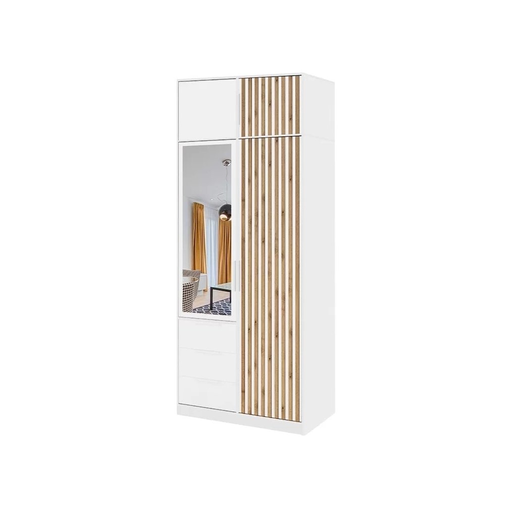 Eredeti bővítés a BALI LUX D2 gardróbszekrényhez gyönyörű fehér színben, tölgyfa wotan dekor lécekkel. A bővítmény elegendő tárhelyet kínál például a szezonális ruhák számára is. A fogantyúk feketék.
