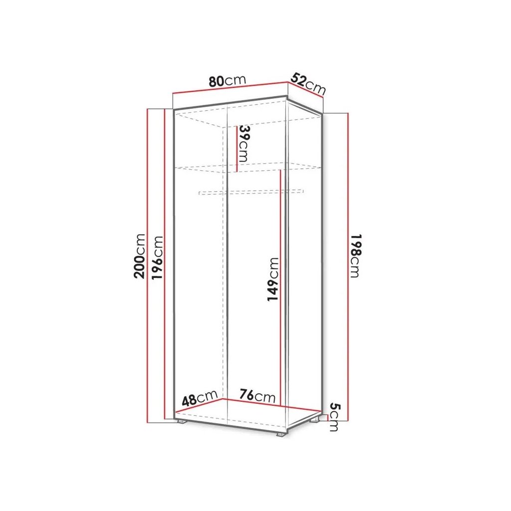 A magas CALABRINI gardrób kiváló minőségű laminált anyagokból készült. A bútorok elülső részei MDF-ből készülnek. Az ABS él jobban ellenáll a sérüléseknek. A műanyag lábak stabilitást biztosítanak, ugyanakkor modern megjelenést kölcsönöznek.