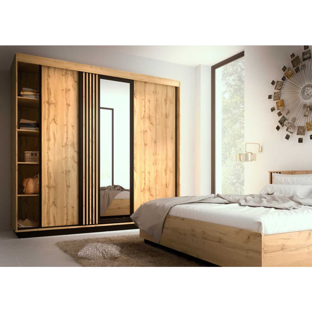 Ha szeretné berendezni hálószobáját, van megoldásunk az Ön számára. A kifinomult CARMELO LA19 szekrény rengeteg tárolóhelyet kínál a népszerű tölgy és fekete színkombinációban. A lécek egyre népszerűbbek és a fekete háttérnek köszönhetően optikailag nagyobbnak tűnik a készlet. Az összbenyomást a fekete lábazat és az egyszerű fekete fogantyúk teszik teljessé, amelyek wotan tölgyfával kombinálva nagyon elegánsak. A CARMELO LA19 gardrób három tolóajtós. Értékelni fogja a bőséges tárolóhelyet és a gardrób stílusos kialakítását .