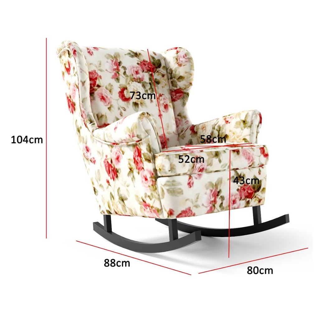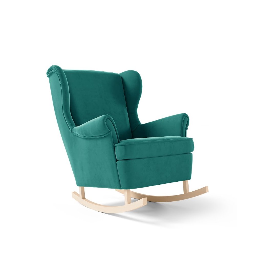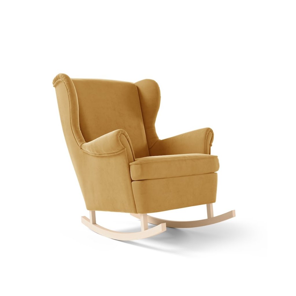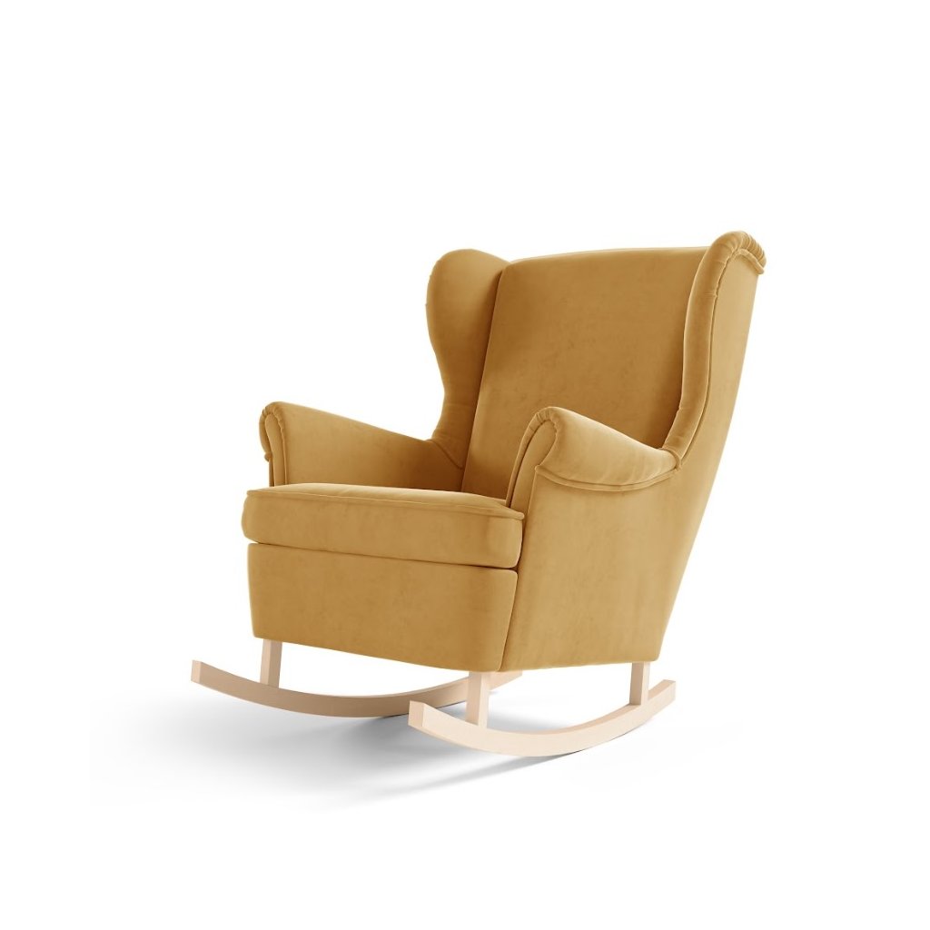 A puha bársony kárpitozással és fa lábakkal ellátott karosszék a kényelmet és az eleganciát ötvözi. Az ülés hullámrugóval van felszerelve, amely optimális kényelmet és támasztást garantál ülés közben. A hintaszék impregnálható , vagy szükség esetén univerzális tisztítószerrel tisztítható .