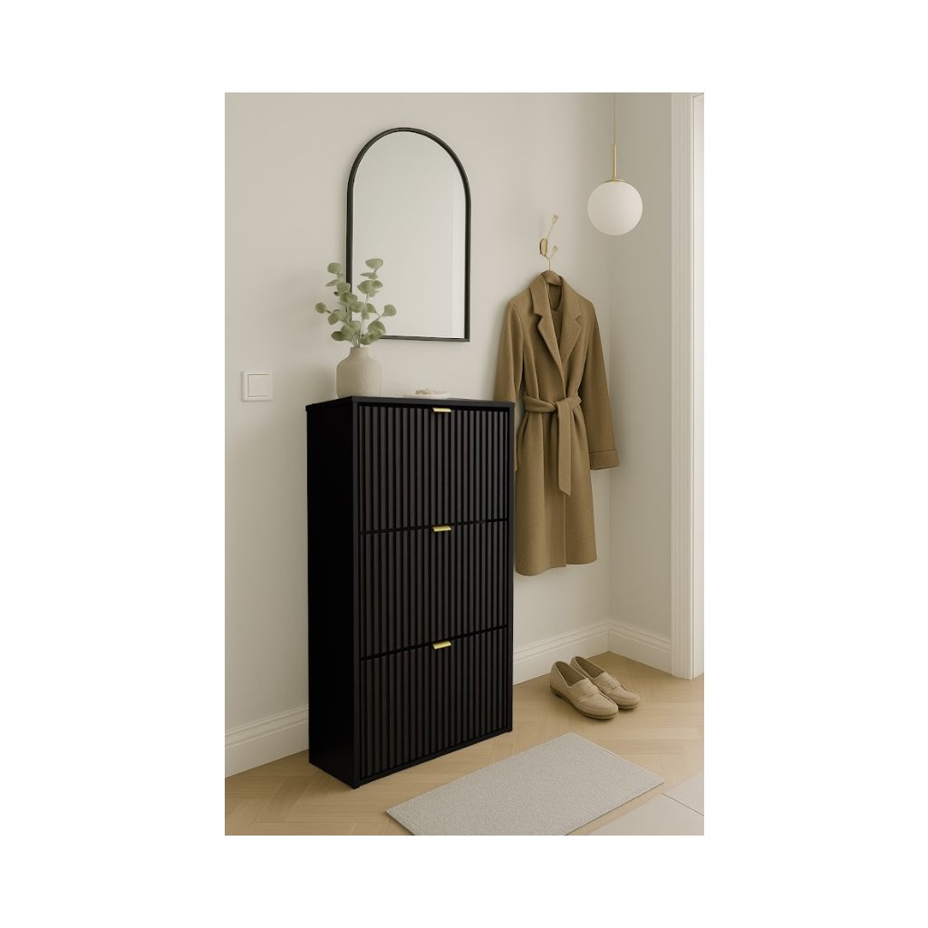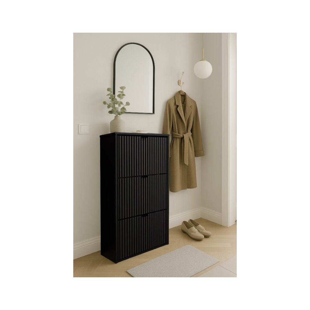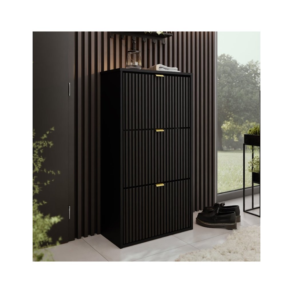A LARO 1 cipőszekrény fekete színben készült, amely tökéletesen illeszkedik a modern enteriőrökbe . A bútor minimalista jellegét elegáns fogantyúk hangsúlyozzák . Az elülső bordázott felületek egyedi és stílusos megjelenést kölcsönöznek a cipőszekrénynek . Tágas kialakításának és csuklós ajtóinak köszönhetően kényelmes és praktikus megoldást kínál a cipők tárolására.