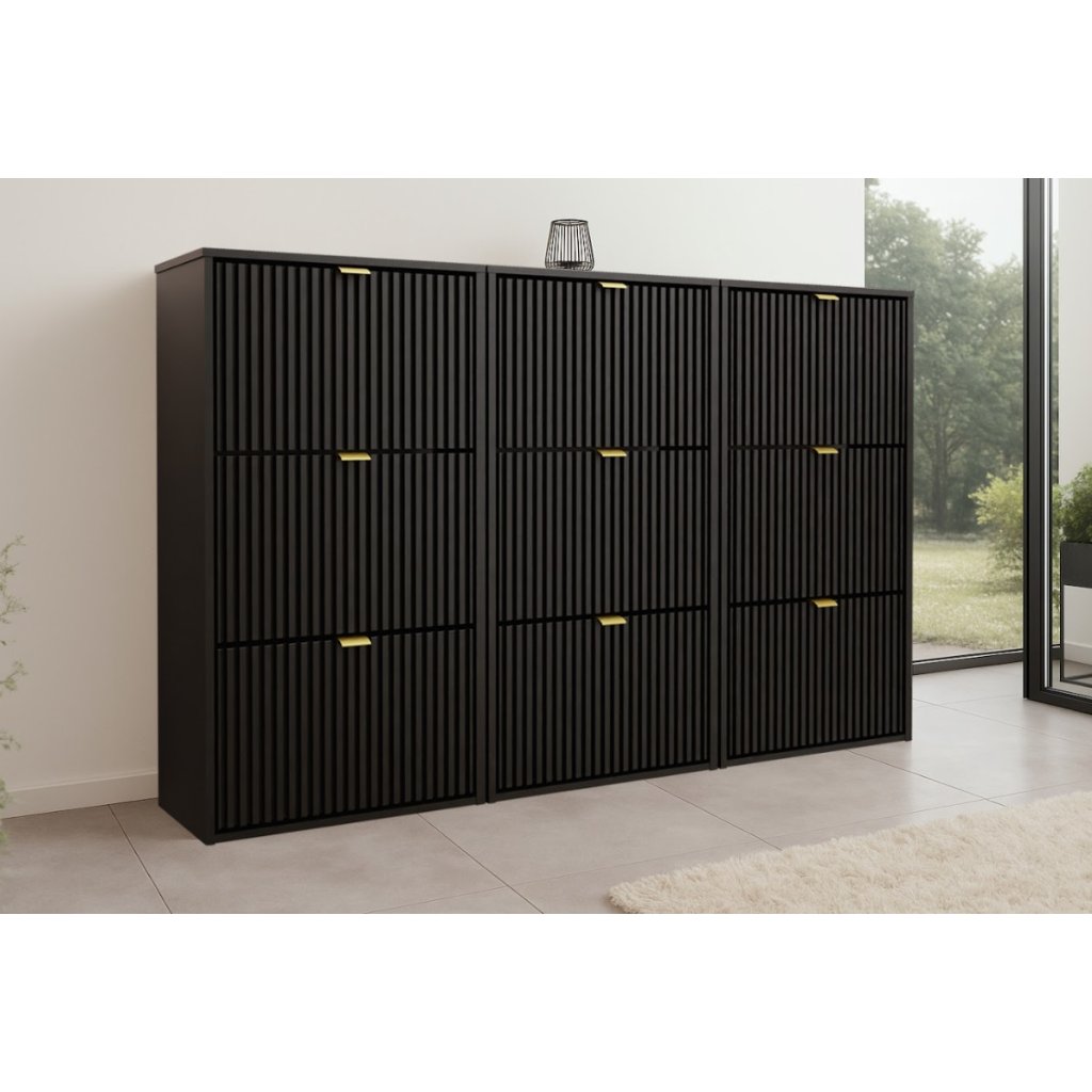 A LARO 3 cipőszekrény fekete színben készült, amely tökéletesen illeszkedik a modern enteriőrökbe . A bútor minimalista jellegét elegáns fogantyúk hangsúlyozzák . Az elülső bordázott felületek egyedi és stílusos megjelenést kölcsönöznek a cipőszekrénynek . Tágas kialakításának és csuklós ajtóinak köszönhetően kényelmes és praktikus megoldást kínál a cipők tárolására.
