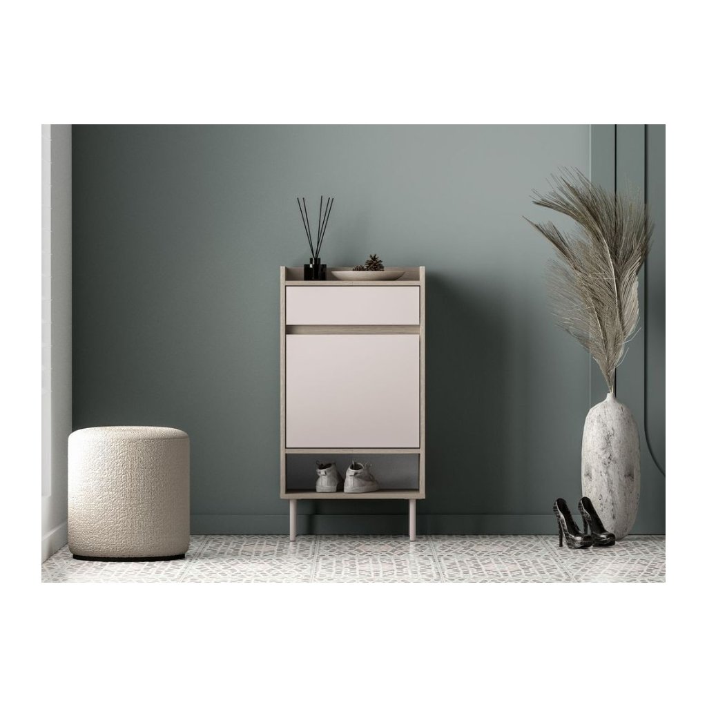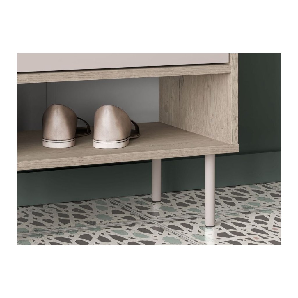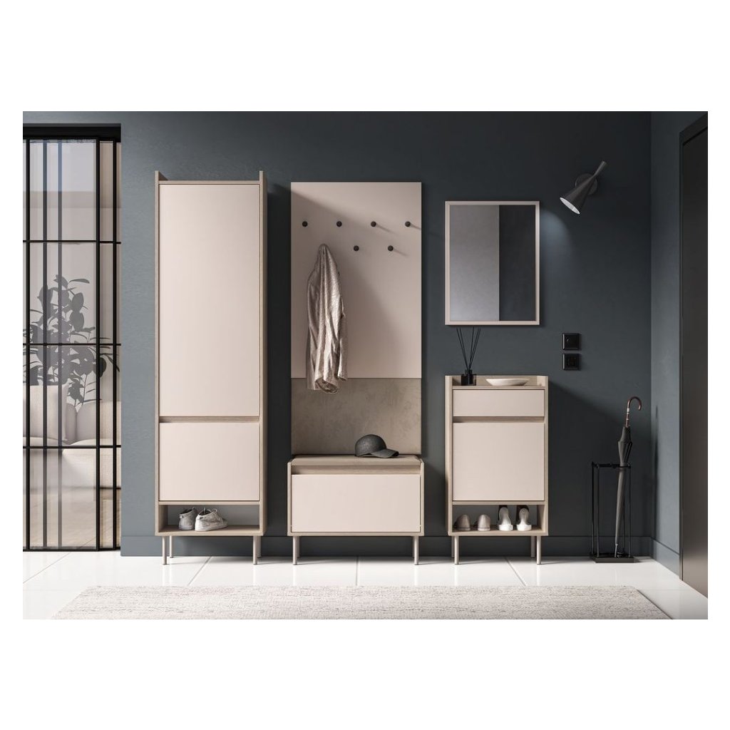 A VOIR 04 cipősszekrény finom kasmír és elegáns cremonai terrakotta tölgy színkombinációjával készült, amely ideális kombinációt alkot, és illeszkedik a modern enteriőrökbe. A fogantyú nélküli előlapok minimalista jelleget kölcsönöznek az egyes elemeknek, az egyszerű fém lábak pedig hangsúlyozzák könnyedségüket , ugyanakkor megkönnyítik a hatékony tisztítást. A bútor magas szintű funkcionalitása kényelmes használatot biztosít minden nap. A cipősszekrény egy polccal, egy ajtóval és egy nyitott polccal rendelkezik.