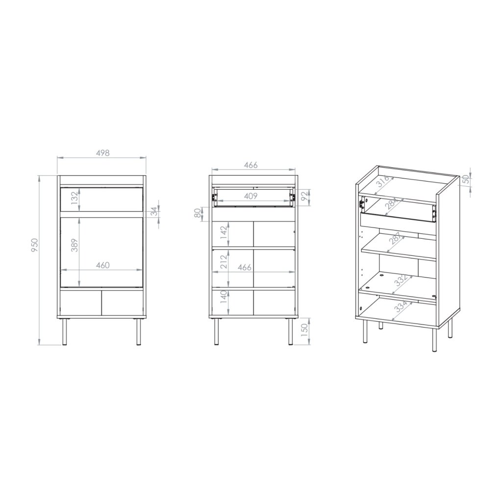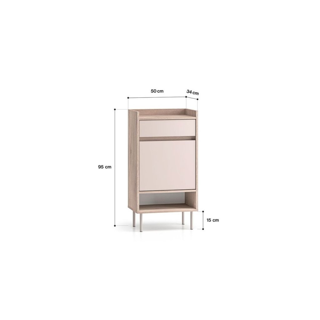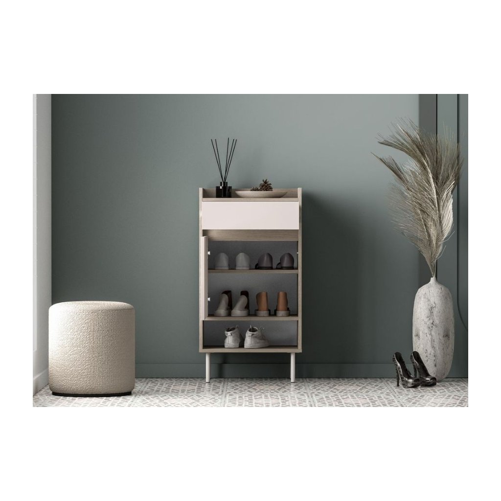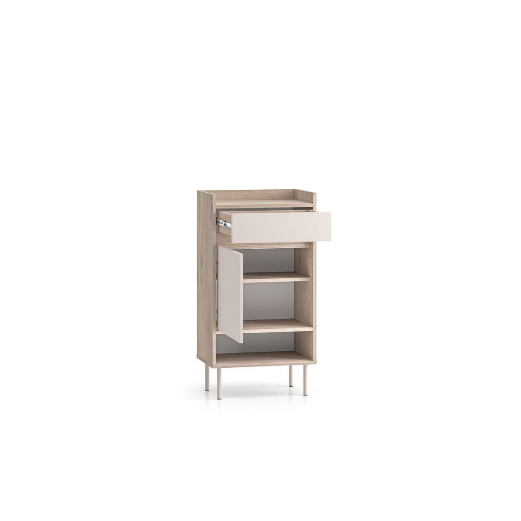 A VOIR 04 cipősszekrény finom kasmír és elegáns cremonai terrakotta tölgy színkombinációjával készült, amely ideális kombinációt alkot, és illeszkedik a modern enteriőrökbe. A fogantyú nélküli előlapok minimalista jelleget kölcsönöznek az egyes elemeknek, az egyszerű fém lábak pedig hangsúlyozzák könnyedségüket , ugyanakkor megkönnyítik a hatékony tisztítást. A bútor magas szintű funkcionalitása kényelmes használatot biztosít minden nap. A cipősszekrény egy polccal, egy ajtóval és egy nyitott polccal rendelkezik.