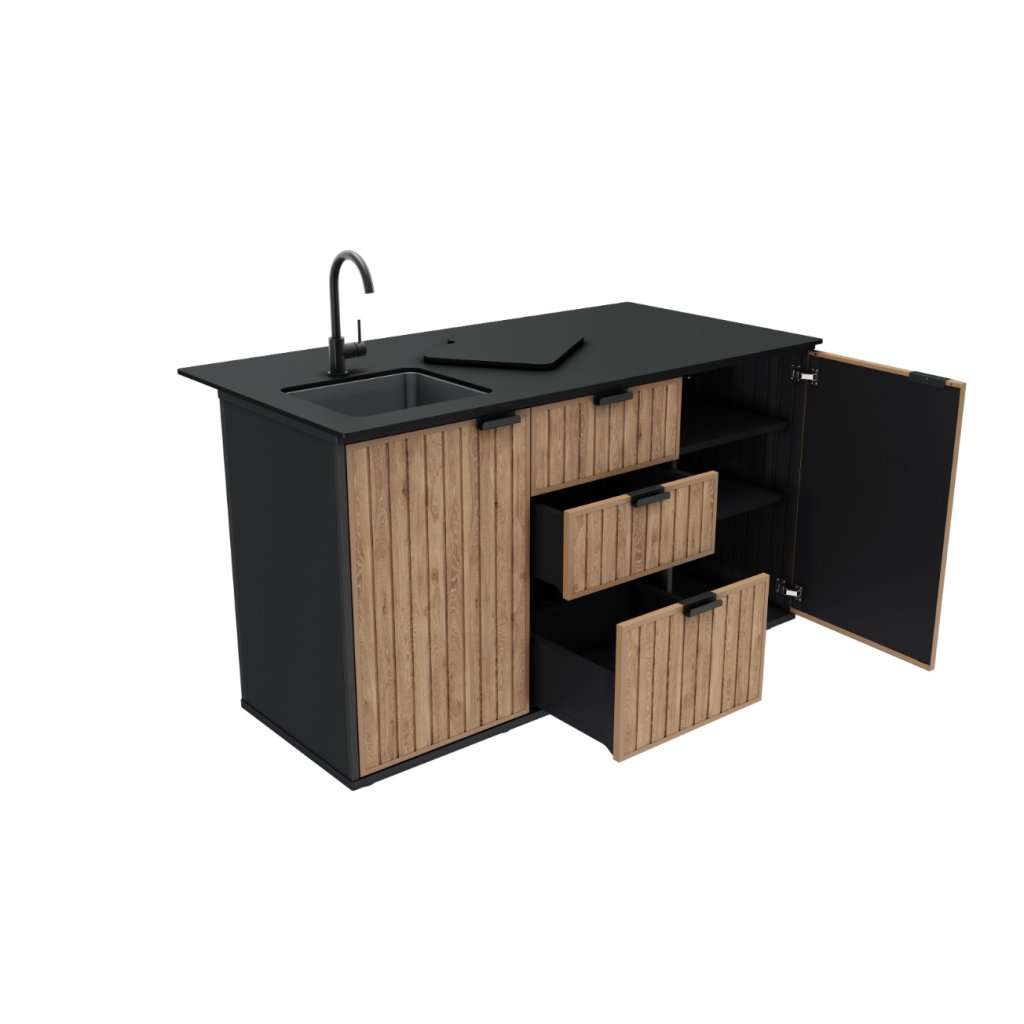 A COMDEPACT kerti asztal Stílusos és funkcionális kültéri konyha kiváló minőségű munkalappal , beépített mosogatóval és tárolóhellyel. A kerti asztal bőséges tárolóhellyel rendelkezik három fiók és egy polcos szekrény formájában, így mindig minden kéznél lesz, amire szüksége van. Praktikus tulajdonsága a hűtőszekrénynek is helyet adó hely, így teljes megoldást kínál a kültéri főzéshez.