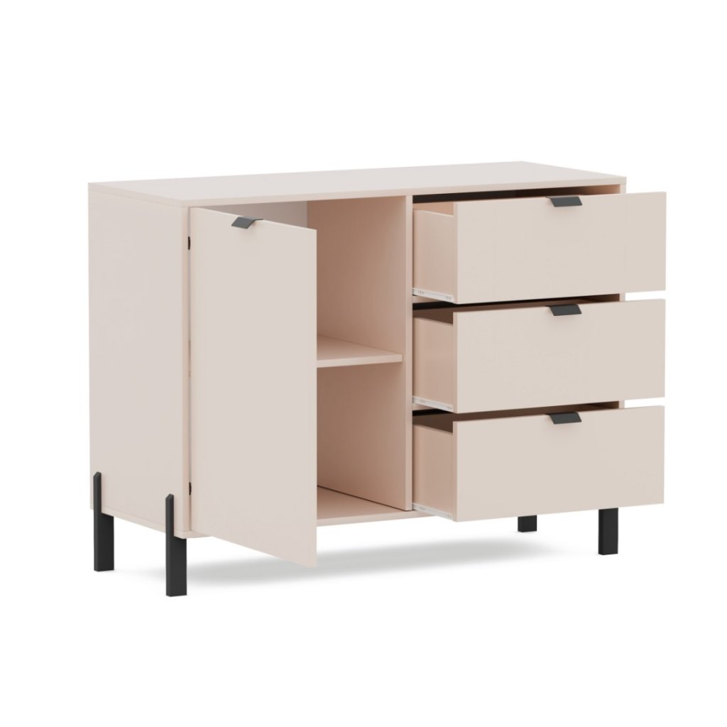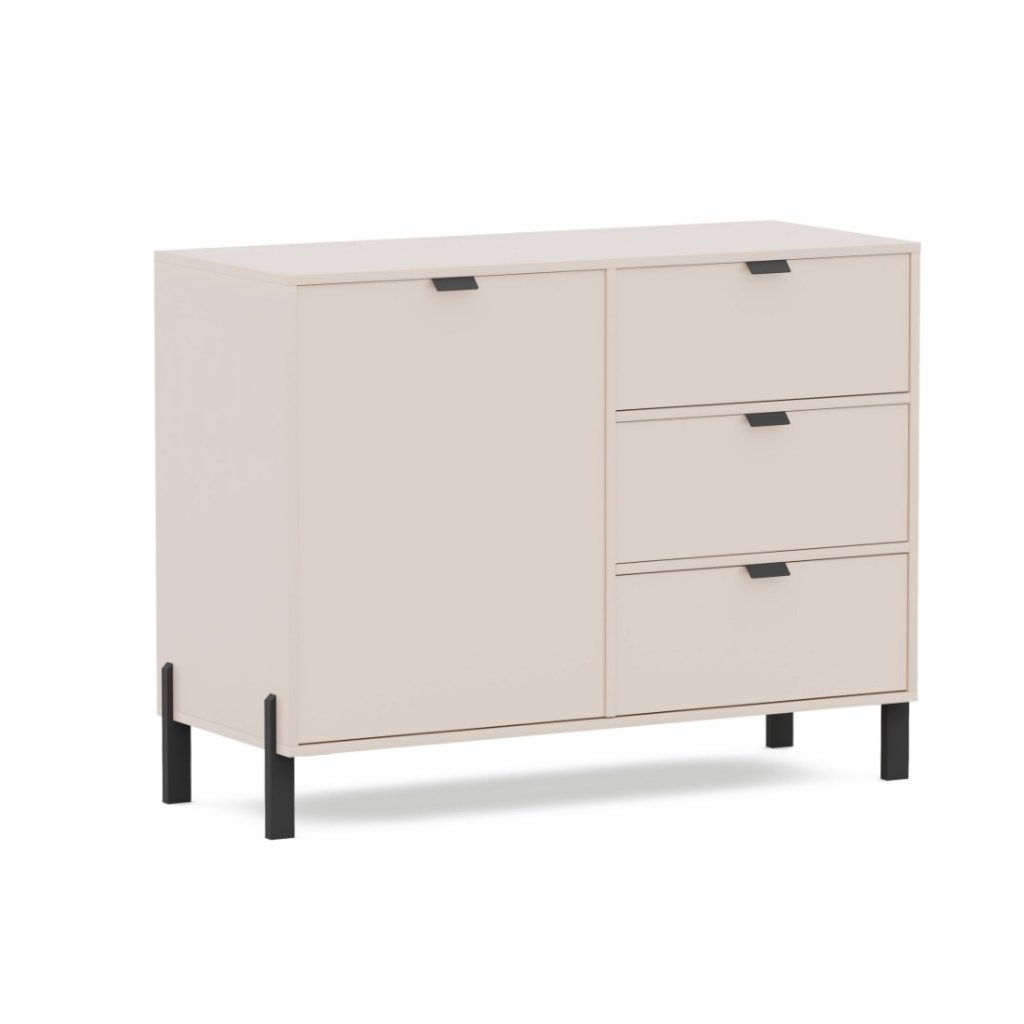 A CREMONA 1D3S fiókos komód ...-ból készült. Világos színű, kasmír árnyalatú dizájn , amely kellemes hangulatot teremt . A fiókos szekrényt elegáns fekete fogantyúk és magas lábak egészítik ki , egyedi stílust kölcsönözve a bútornak . A komód egy ajtóval és három tágas fiókkal rendelkezik. Egy természetes, hangulatos és békés, pihenést elősegítő belső tér megteremtéséhez a kasmír bútorok az ideális választás .