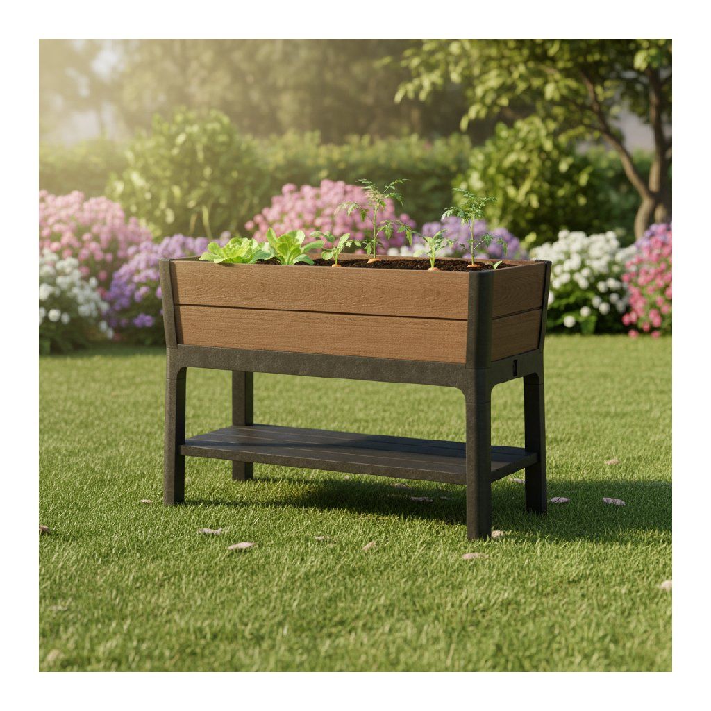 Az elegáns és stílusos DARTED virágcserép megkönnyíti a növények termesztését. További előnye a polc, amelyre a szükséges kerti kiegészítőket helyezheti. A virágcserép kiváló minőségű, barna színű anyagokból készült. A felület szerkezete a természetes fát utánozza , kiemelve a bájt és a stílust.