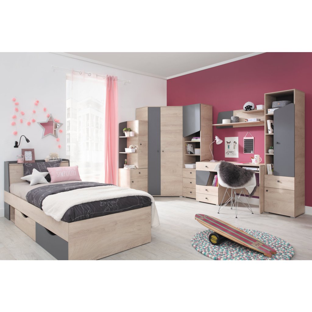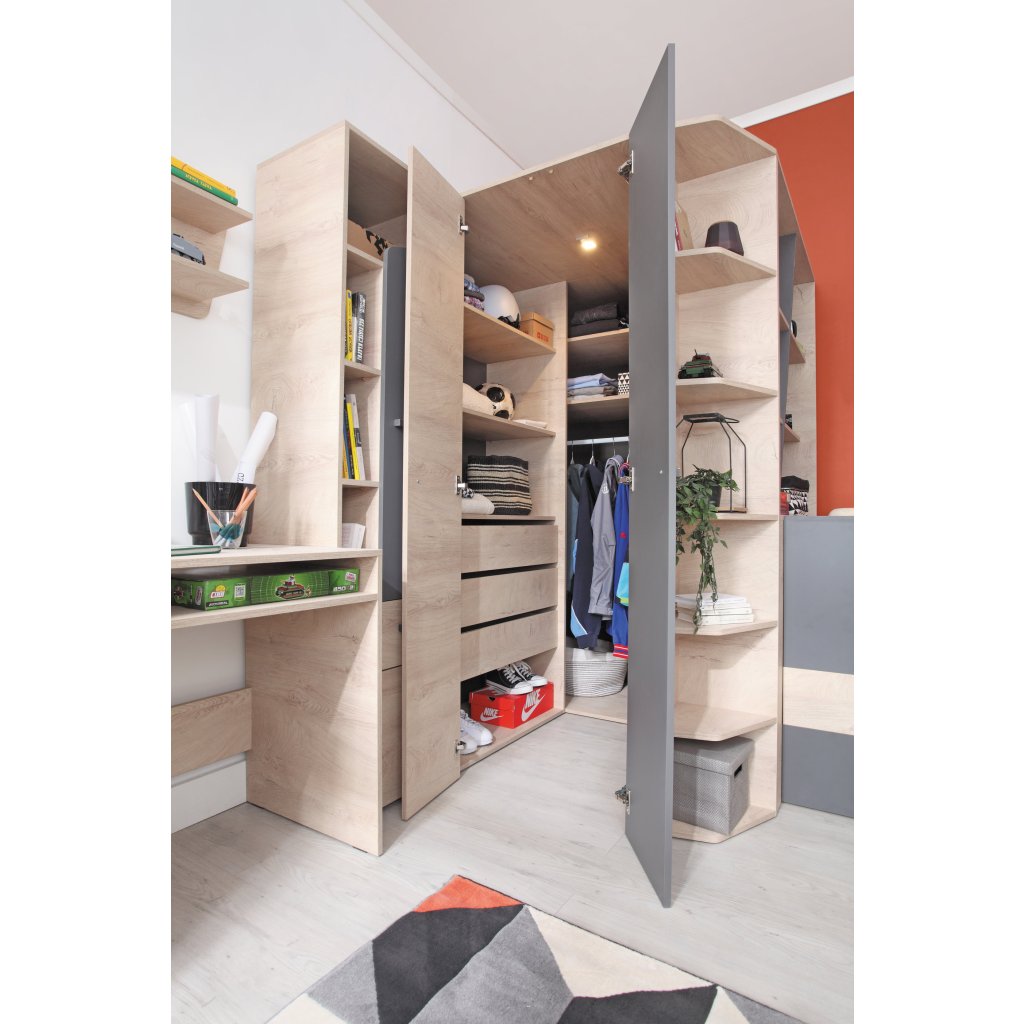 Az eredeti DELTA szektor bútorkollekció tölgy és sötét antracit modern kombinációjában készült. A DELTA gyerekszoba lányoknak és fiúknak egyaránt alkalmas, a megfelelő kiegészítőkkel és falszínekkel tökéletes helyet teremthet gyermekei számára. A DELTA kollekció számos szegmenst kínál, amelyek garantáltan elegendő teret biztosítanak a tanuláshoz és a szórakozáshoz. A DELTA DL1 L/P gardrób praktikus belső elrendezéssel rendelkezik, fiókokkal, polcokkal és ruhaakasztó rúddal rendelkezik. Kívül polcok találhatók könyveknek vagy játékoknak. A gardrób világítása nem része az árnak, de 46 euróért megrendelhető , mozgásérzékelővel kapcsolható be .