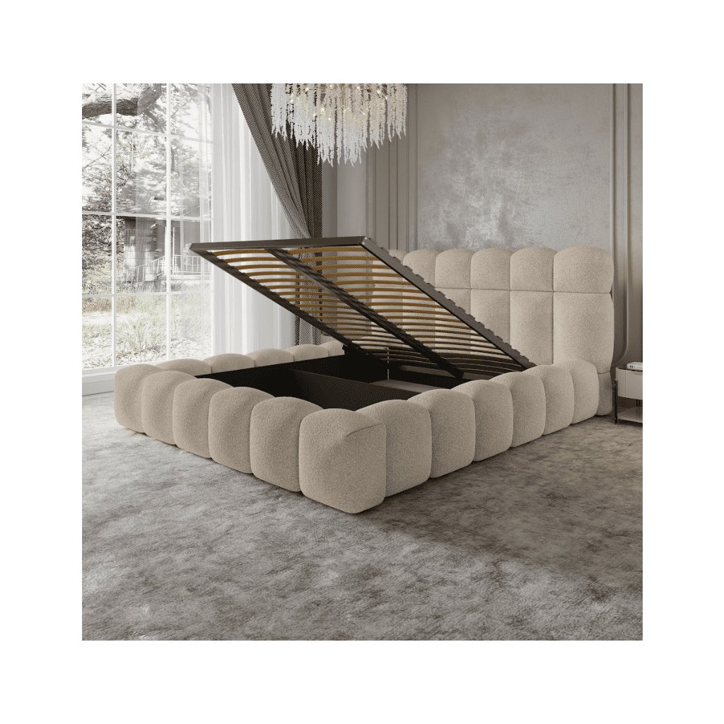 Az ágy kiváló minőségű QUELLE kárpitozott anyaggal van kárpitozva, amelyet nagy kopásállóság és könnyű karbantartás jellemez. Az ágykeret LTD (laminált farostlemez) lapokból készült, amelyek tartósságukról, méretstabilitásukról és hosszú élettartamukról ismertek. A tartóelemek tömörfa elemeket használnak, amelyek nagyfokú stabilitást biztosítanak az ágynak. A fa egy ökológiai, erős és időtálló anyag, amely hosszú távú megbízhatóságot biztosít. A puha kárpitozott részek poliuretán habbal vannak töltve, amely kellemes kényelmet és méretstabilitást biztosít. Az összecsukható rácsos ágy és a tárolórekesz fémkonzolokkal van megerősítve, amelyek biztosítják a mechanizmusok sima nyitását, stabilitását és hosszú élettartamát. Az ágy impregnálható , vagy szükség esetén univerzális tisztítószerrel tisztítható .