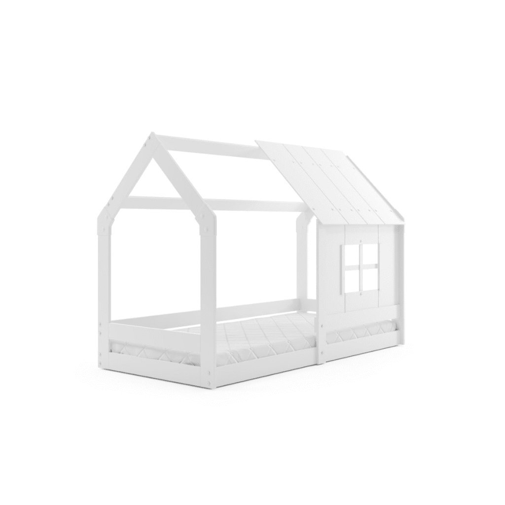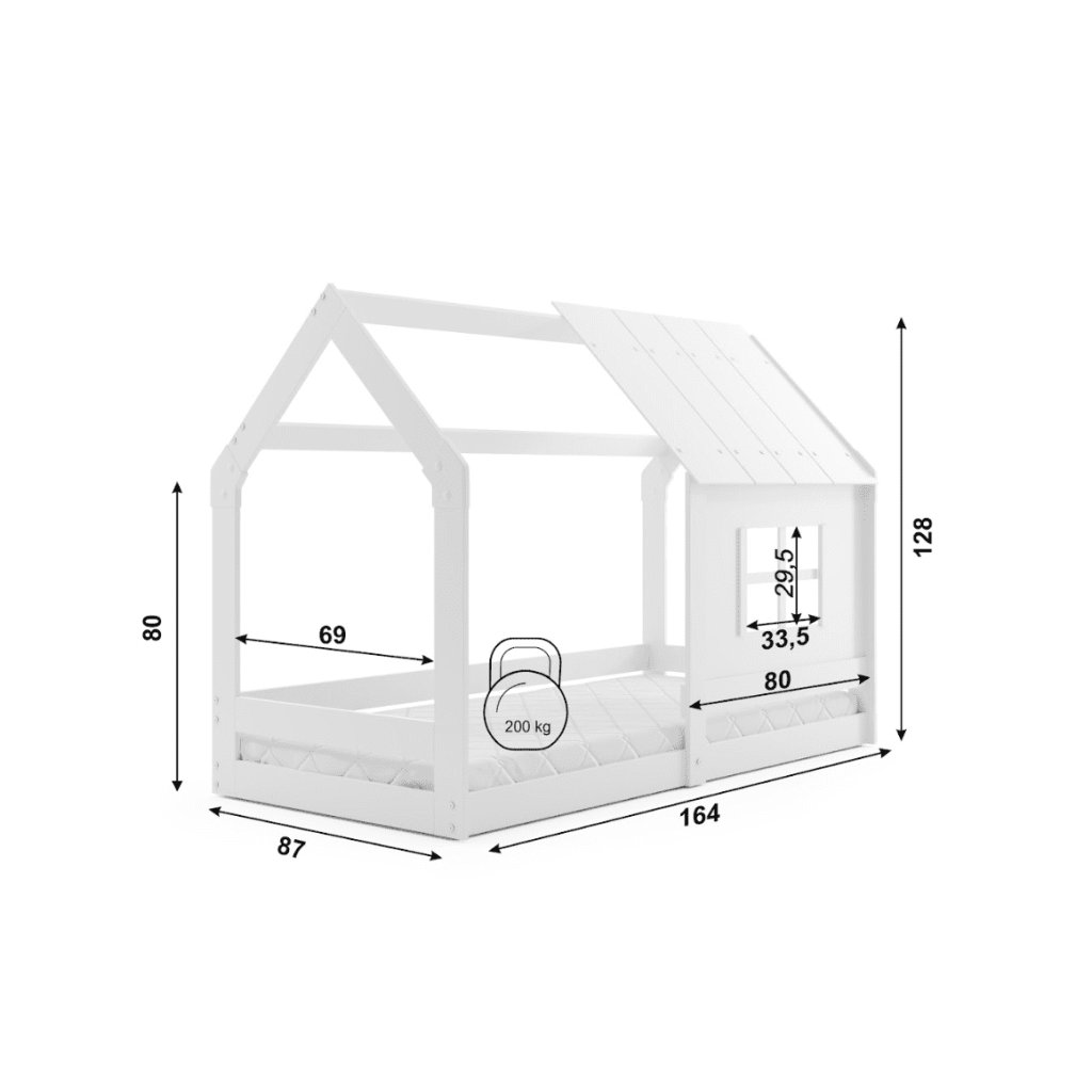 A 80 x 160 cm-es, házikó alakú gyerekágy a kényelem, a biztonság és a játékos dizájn tökéletes kombinációja. Kiváló minőségű fából készült és fehérre festett, így gyönyörűen illeszkedik bármilyen modern vagy klasszikus gyerekszoba enteriőrbe. Az ágy jellegzetessége a házikó alakú, ablakkal ellátott kialakítás , amely hangulatos helyet teremt az alváshoz és a játékhoz. Az ablak autentikus megjelenést kölcsönöz az ágynak, és támogatja a gyermekek fantáziáját - akár búvóhellyé, olvasósarokká vagy egy kis játszótérré alakítják az ágyat. Az ágyat a Montessori-elvek ihlették - az alacsony szerkezet lehetővé teszi a gyerekek számára, hogy önállóan ki- és bemásszanak az ágyba, ami támogatja függetlenségüket és önbizalmukat. A stabil szerkezet és a biztonságos peremkidolgozás garantálja a maximális biztonságot. Az ágy ára tartalmazza a rácsos ágyrácsot , a matracot külön kell megrendelni.