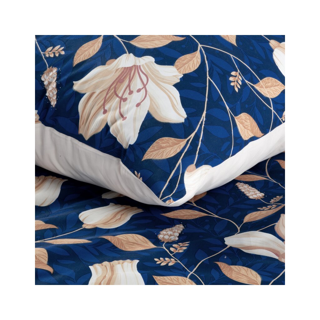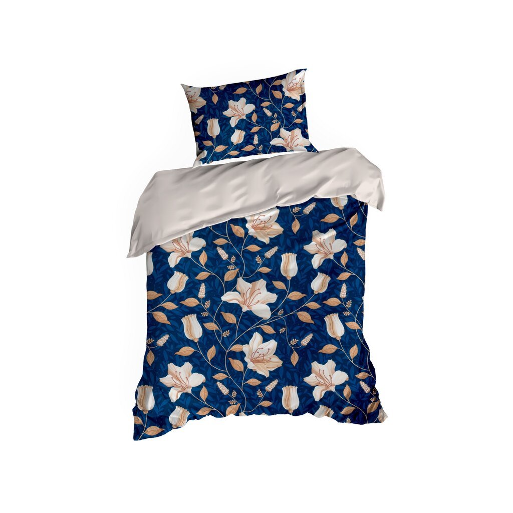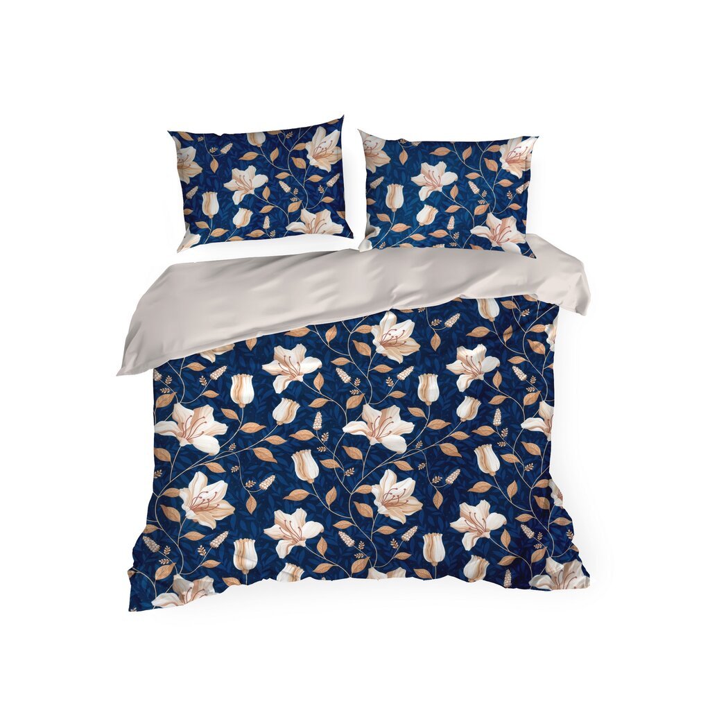 Nyomtatott pamut szatén ágyneműgarnitúra Szélesség: 160 cm, Hossz: 200 cm, Szín: sötétkék, Súly: 125 GSM, Összetétel: szatén, 100% pamut. A csomag tartalma 1 db 160 x 200 cm, 2 db 70 x 80 cm.