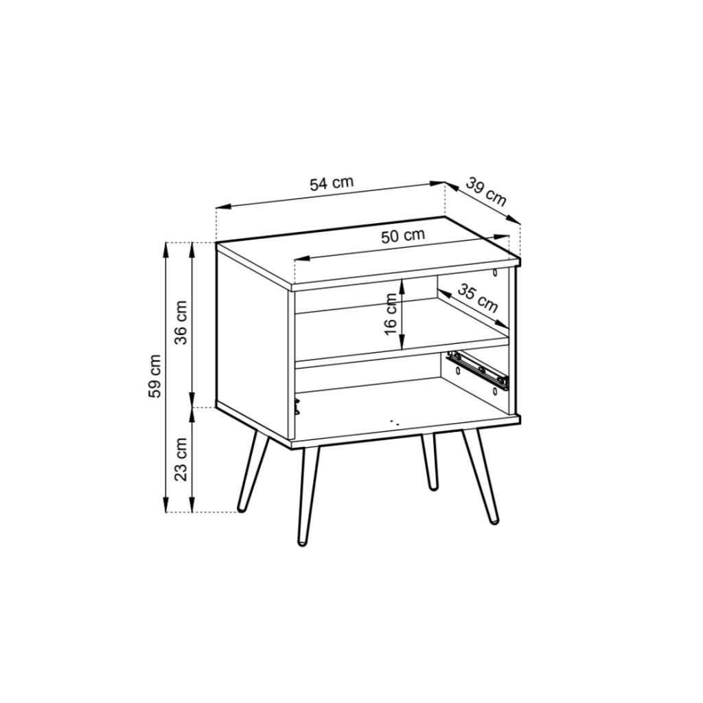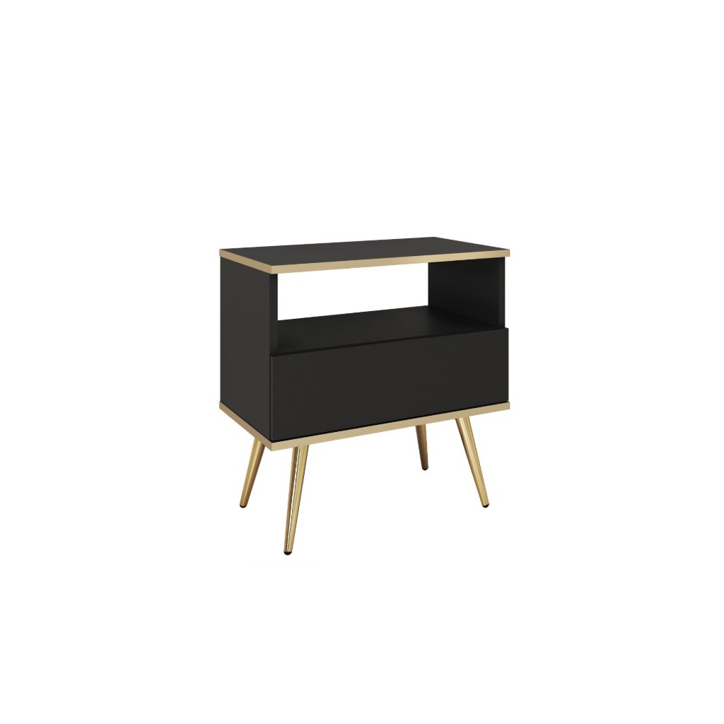 Nagyon praktikus BIJOU S-54 éjjeliszekrény fekete színben, arany kombinációval a lábakon. Az arany szíj időtlen, és nagyon elegánsan néz ki a kiegészítőkkel. Ez a kombináció jól illeszkedik bármilyen stílushoz és színhez a belső térben. Éjjeli szekrény Egy fiókkal és egy nyitott polccal rendelkezik, rengeteg tárolóhellyel. Díszítse stílusosan hálószobáját vagy diákszobáját egy csipetnyi eleganciával .