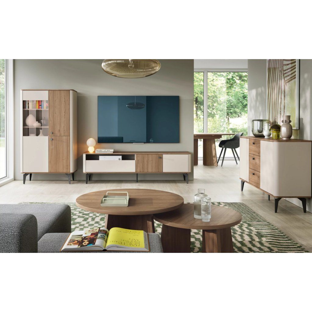 A bútor kiváló minőségű, 16 mm vastagságú laminált forgácslapból készült. A váz kasmír felületkezelésű, míg az ajtók és a teteje királyi dió színű, amely természetes fa megjelenést kölcsönöz nekik. Az egyes részek élei tartós ABS éllel vannak ellátva , amely megvédi az anyagot a sérülésektől és a nedvességtől. A váz kasmír színű éllel van ellátva, míg az ajtók kasmír és királyi dió színűek kombinációja. A teteje vastagabb, királyi dió színű ABS éllel rendelkezik a nagyobb tartósság érdekében. A lábak fekete fémből készültek, ami biztosítja a teljes szerkezet stabilitását és szilárdságát . A fogantyúk műanyagból készültek , szintén fekete színben. Tisztításhoz puha, enyhén nedves ruhát használjon. Kerülje az agresszív tisztítószereket és a durva szivacsokat. Tisztítás után törölje szárazra a felületet.