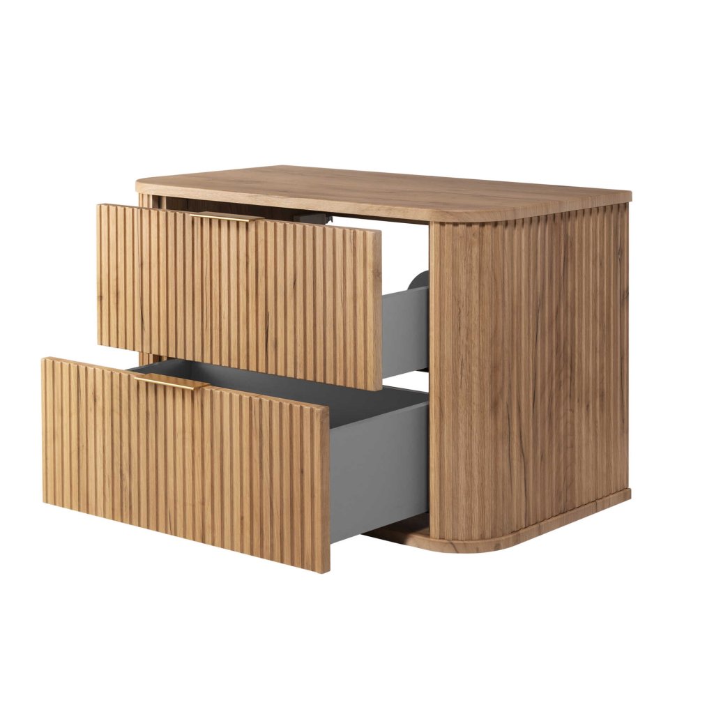 A 80 cm-es mosdószekrény ideális megoldás mindazok számára, akik több tárolóhelyet szeretnének a fürdőszobájukban a dizájn feláldozása nélkül. Az ELEGANCE Craft arany mosdószekrény időtlen fadekorral, amely meleg és természetes hatást kelt. A domináns elem a függőlegesen barázdált előlap , egy modern részlet, amely a fürdőszobát dizájnos térré teszi. A tárolóhely praktikus felosztása lehetővé teszi, hogy mindent rendezetten tároljunk - a mindennapi kozmetikumokat, a drogériás holmikat és a nagyobb csomagokat vagy textíliákat. A fekete fogantyúk stílusos kontrasztot alkotnak, és tökéletesen illenek a modern fürdőszobai kiegészítőkhöz, egy csaptelephez vagy egy fekete dizájnú tükörkerethez.