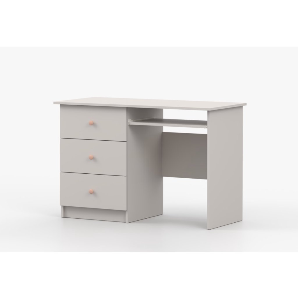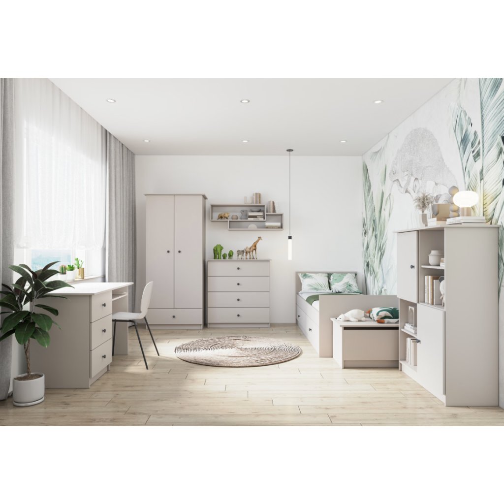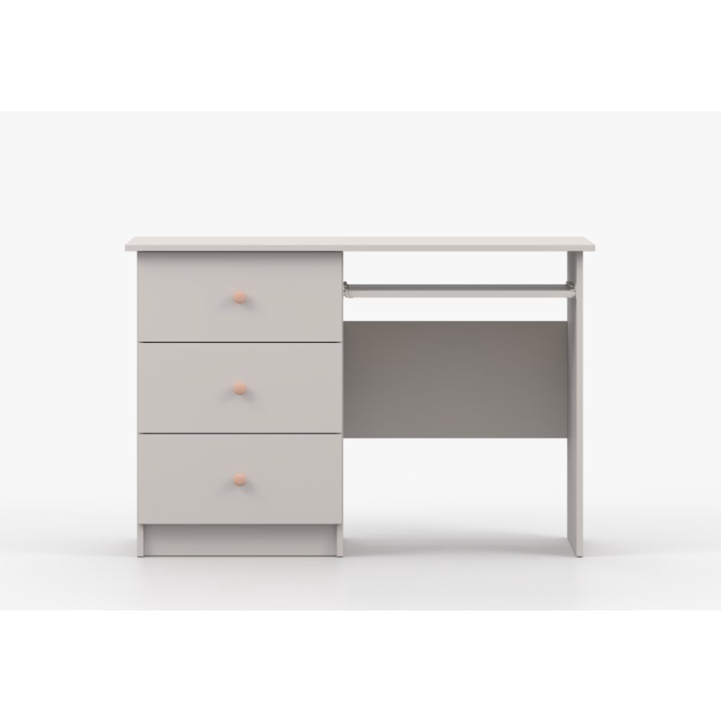 A modern ELFI íróasztal ideális hely iskolás gyerekek és fiatal kreatív gyerekek számára. Elegendő munkafelületet biztosít a házi feladatok írásához, olvasáshoz és kreatív tevékenységekhez. A modern bézs dizájn időtlen hatású, és könnyen kombinálható a szoba többi bútorával. A praktikus fiókok és tárolórekeszek rendben tartják az összes szükséges eszközt - a füzetektől, könyvektől az iskolai felszerelésekig. Az íróasztalt rózsaszín vagy grafit színű fogantyúk egészítik ki, amelyek játékos vagy éppen ellenkezőleg, elegáns jelleget kölcsönöznek neki, választás szerint. Teremtsen harmonikus környezetet gyermeke számára , ahol mindennek megvan a maga helye.
