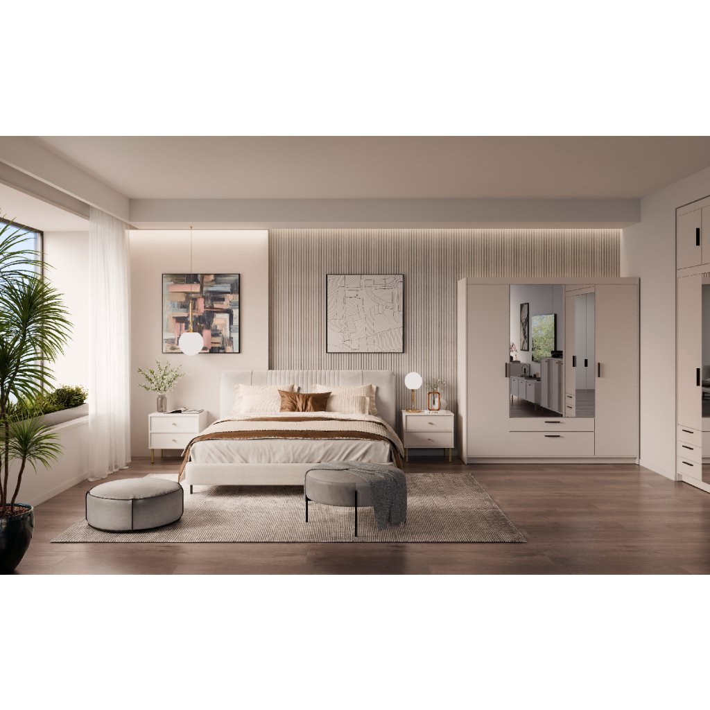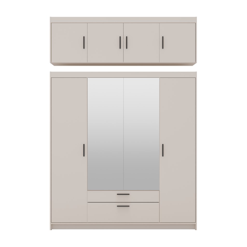A tükrös/homokbézs 4D2S kombinált gardróbszekrény kiváló minőségű , 15 mm-es laminált anyagból készült, amely tartósságot, hosszú élettartamot és az Ön elégedettségét garantálja. A praktikus kialakítás, a rendkívüli tükrös ajtók, az időtlen bézs dizájn, a tökéletes dizájn és a modern megjelenés a bútor tipikus jellemzői. Gyönyörű fekete műanyag fogantyúk teszik teljessé a gardróbot. Tehát ne habozzon tovább, és tegye tökéletessé hálószobáját az ELLEN 4D2S tükrös/homokbézs gardróbszekrény formájában. Ha érdekli, rendelhet bővítményt is az ELLEN 4D/homokbézs gardróbszekrényhez .
