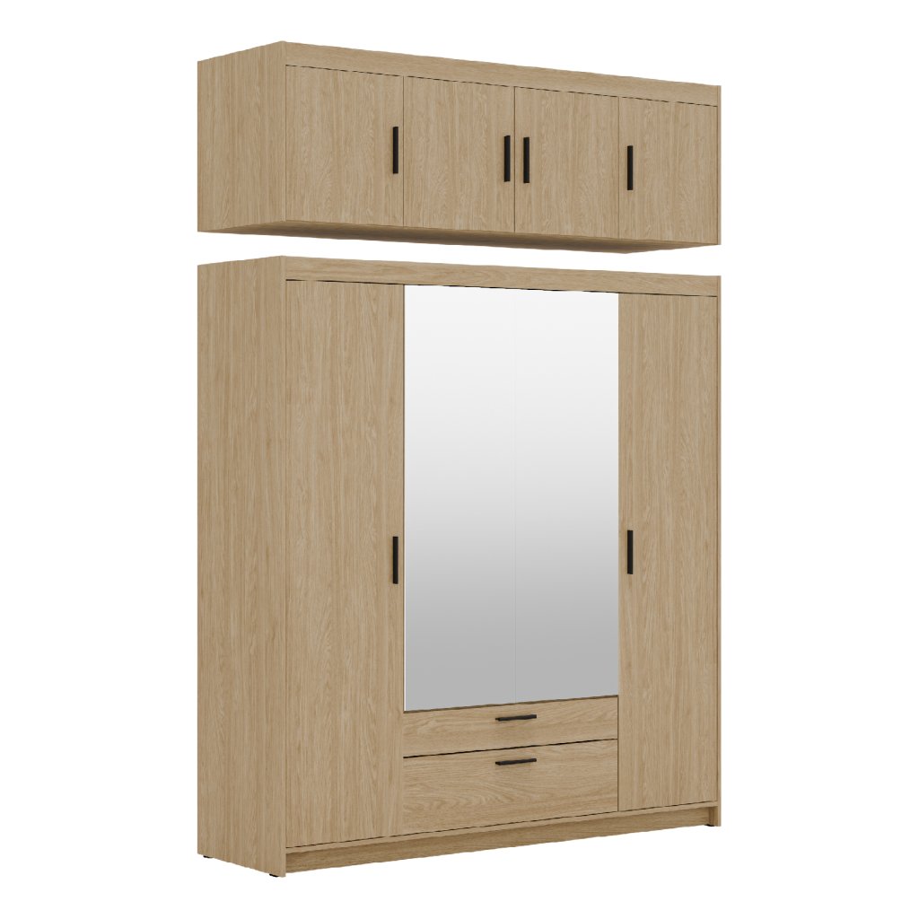 A tükrös / olajozott tölgyfa 4D2S kombinált gardróbszekrény kiváló minőségű 15 mm-es laminált anyagból készült, amely tartósságot, hosszú élettartamot és az Ön elégedettségét garantálja. A praktikus kialakítás, a rendkívüli tükrös ajtók, az időtlen barna felület, a tökéletes dizájn és a modern megjelenés a bútorok jellemző jellemzői. Gyönyörű fekete műanyag fogantyúk teszik teljessé a gardróbot. Tehát ne habozzon tovább, és tegye tökéletessé hálószobáját az ELLEN 4D2S tükrös / olajozott tölgyfa gardróbszekrény formájában. Ha érdekli, az ELLEN 4D / olajozott tölgyfa gardróbszekrényhez bővítményt is rendelhet.
