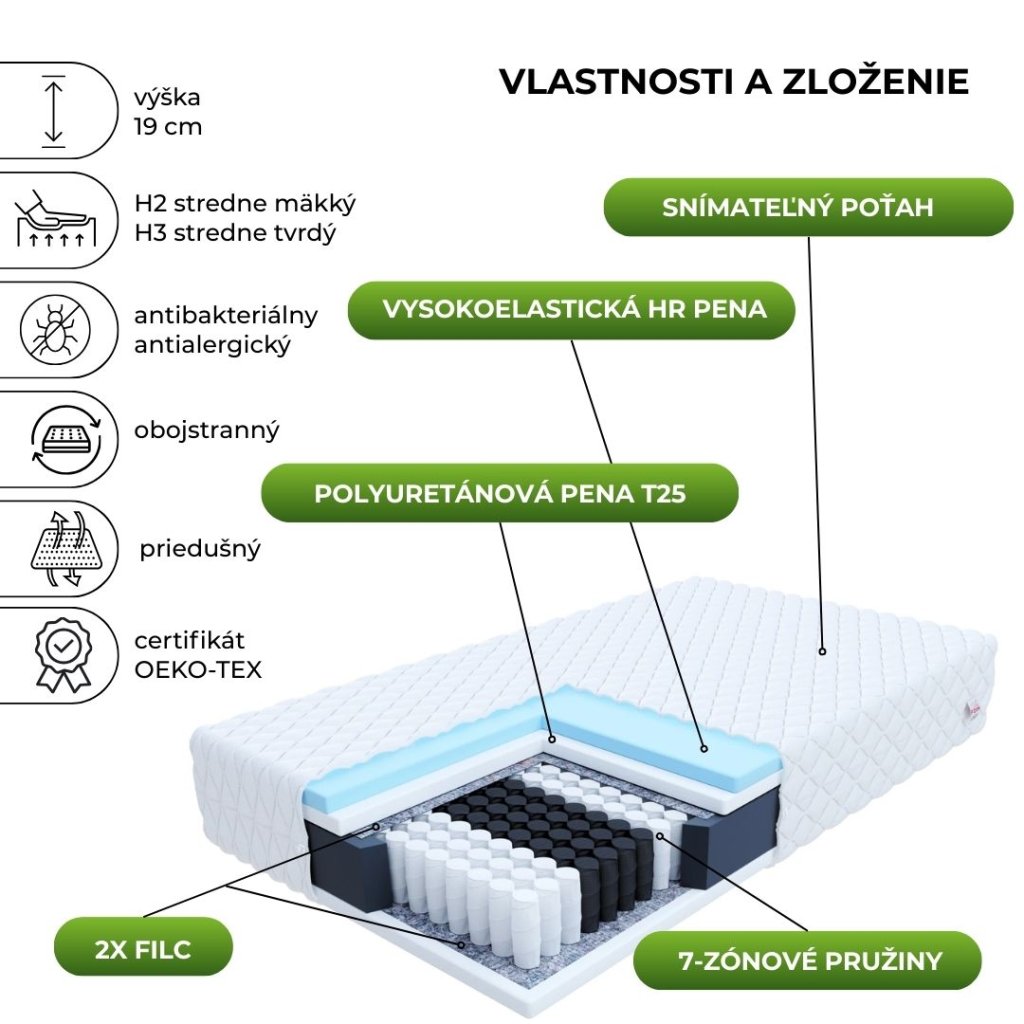 A gerinc helyes elhelyezéséért alvás közben nem csak a habok a felelősek, hanem mindenekelőtt a matrac közepe : a zsebbetét. Jellemzője, hogy minden rugó külön zsebben van elhelyezve, így önállóan, a többitől függetlenül tud működni. A matrac tehát megfelelően tud reagálni az egyes testrészek nyomására, így alvás közben a gerinc a legegészségesebb pozícióba kerül. Annak érdekében, hogy a matrac még jobban támassza az alakot, 7 támasztózónára van osztva, igazodva az egyes testrészek súlyához és nyomásához (a fej vagy a láb alatti rugók finomabban működnek, mint pl. csípő vagy váll). A steppelt Premium Jersey huzat első osztályú hipoallergén anyagokból készült, amelyek rendkívül ellenállnak a sérüléseknek és a szennyeződéseknek. A huzat kimosható, ha szennyeződött.