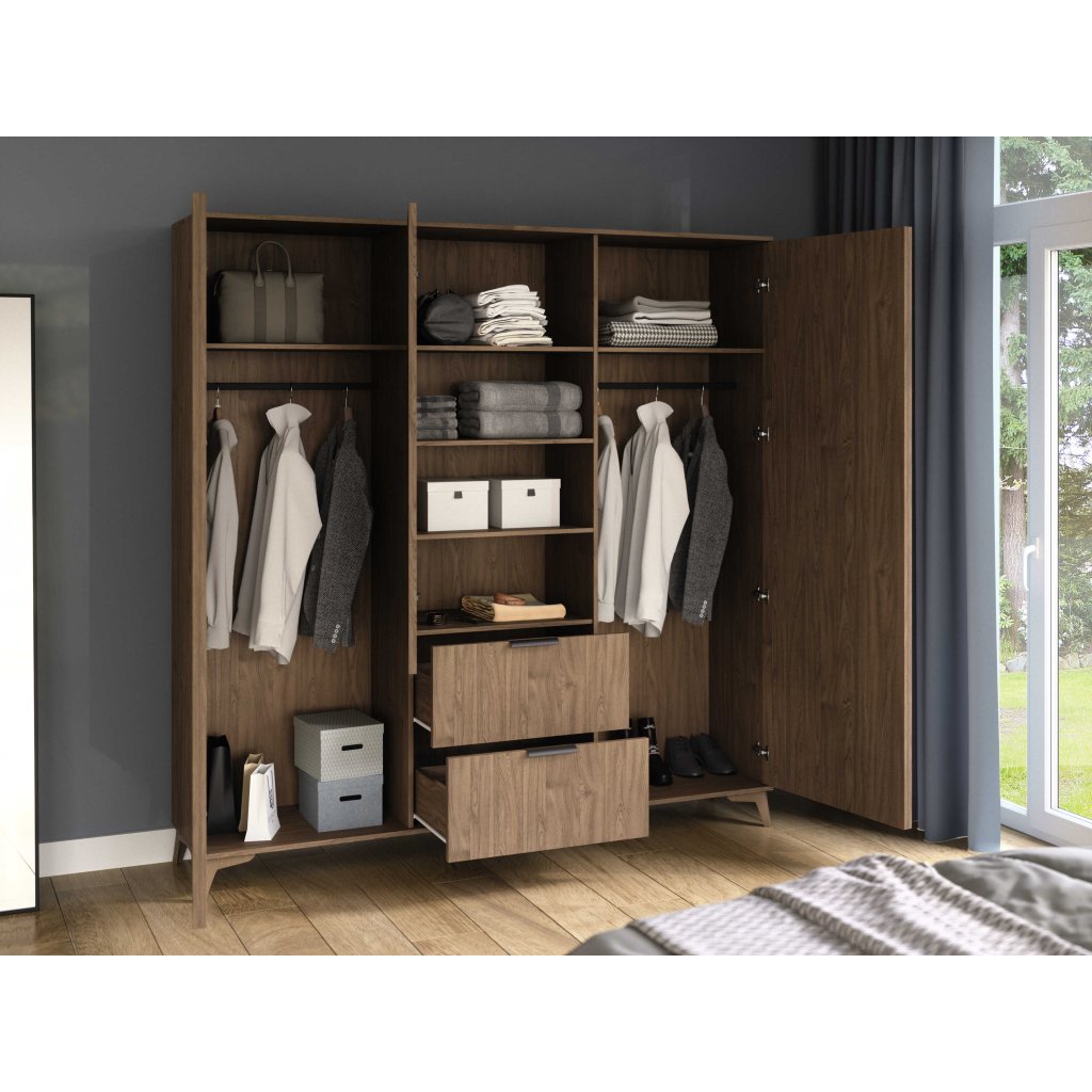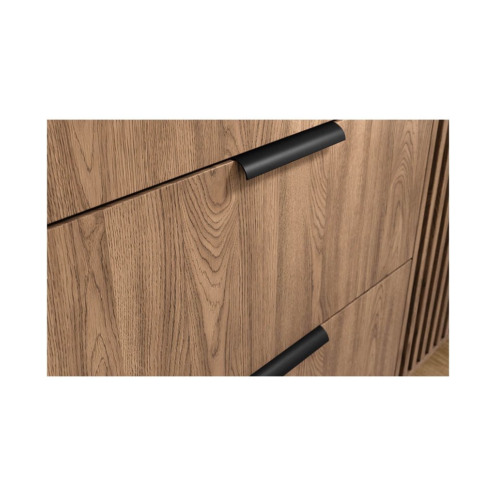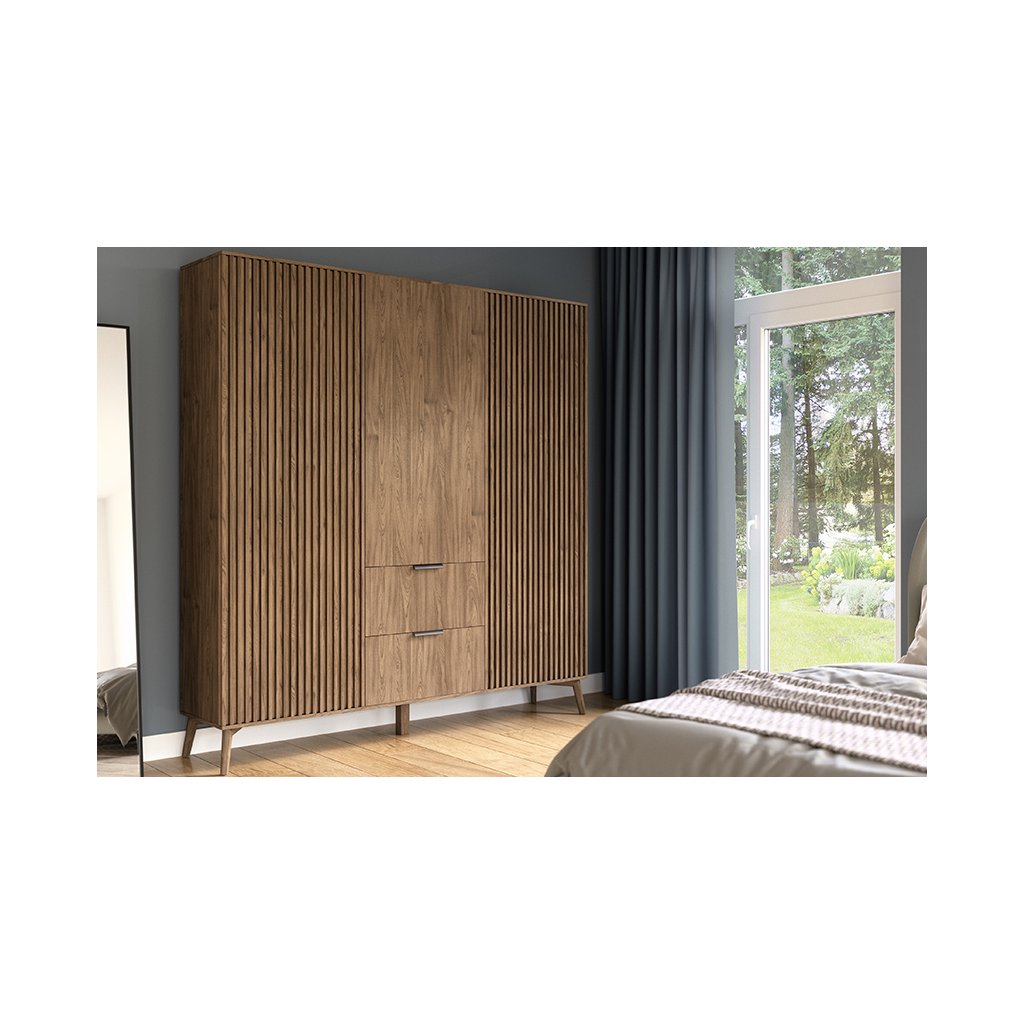 Az ENTSIAN gardróbszekrény mart előlapokkal rendelkezik, ami azt jelenti, hogy a felületén bevágások találhatók, amelyek érdekes dizájnelemet alkotnak. A természetes és kiváló minőségű megjelenést a kézműves tölgy színe egészíti ki. Az Enstian a specifikációival ideális azok számára, akik a modern dizájn és a fa természetes megjelenésének kombinációját keresik, mindezt a masszív és tartós konstrukció előnyeivel. Eredeti, modern mart bútorokkal hangulatos hálószobát vagy nappalit alakíthat ki. Az Entsian gardróbszekrény különféle elemek kombinációja : két fiók, hat zárt polc és két vállfa. A fiókok nagyszerű helyet biztosítanak összehajtott tárgyak, például sportpulóverek, zoknik vagy sálak tárolására is.