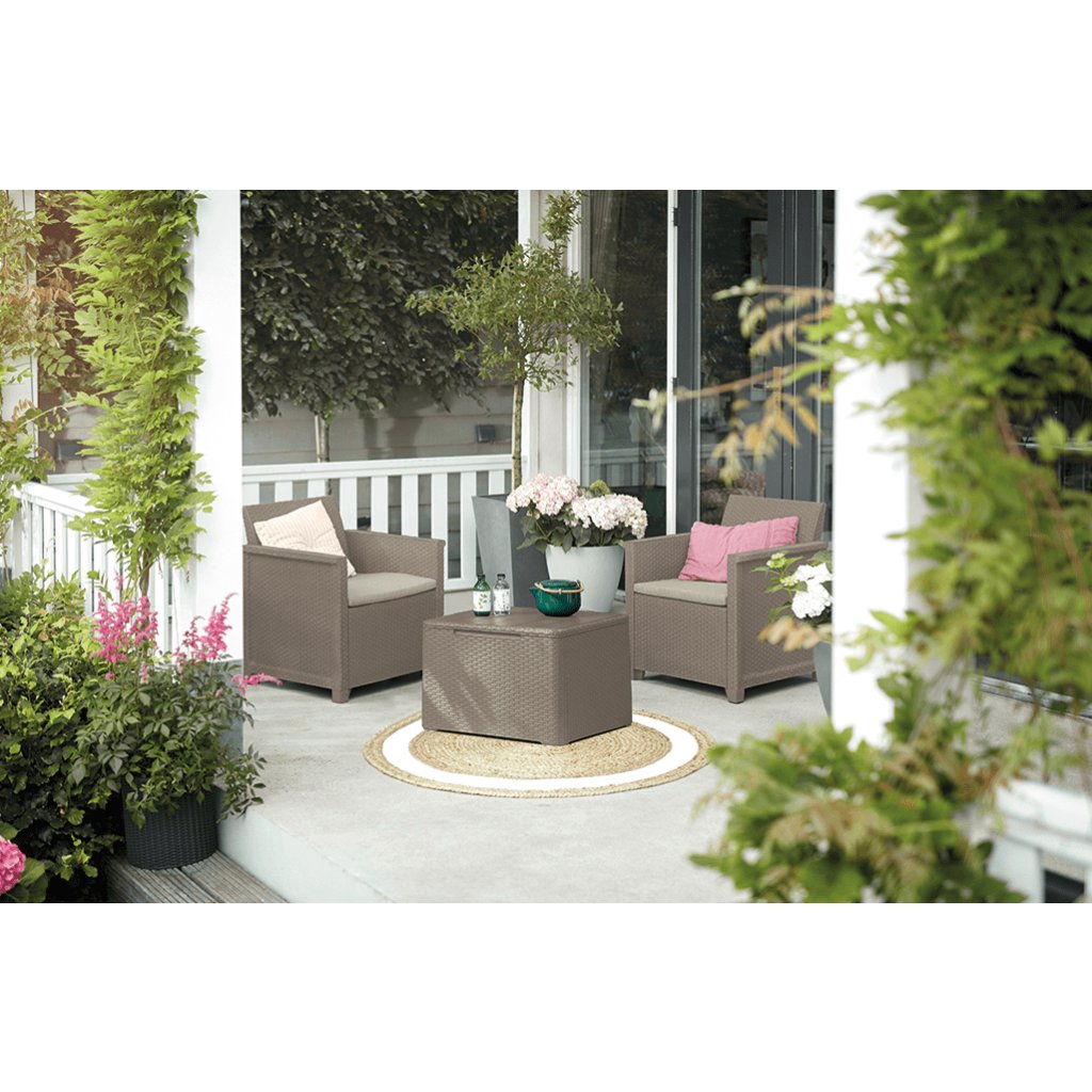 A modern, rattan utánzatú ALODIA erkélyláda remekül mutat modern és retro életstílusban egyaránt. A készlet két fotelből és egy asztalból áll, amely egyben dobozként is szolgál. A termékhez kényelmes párnák tartoznak, stílusos színekben. A könnyű és stabil bútorkonstrukció kültéri és beltéri használatra egyaránt tökéletes.