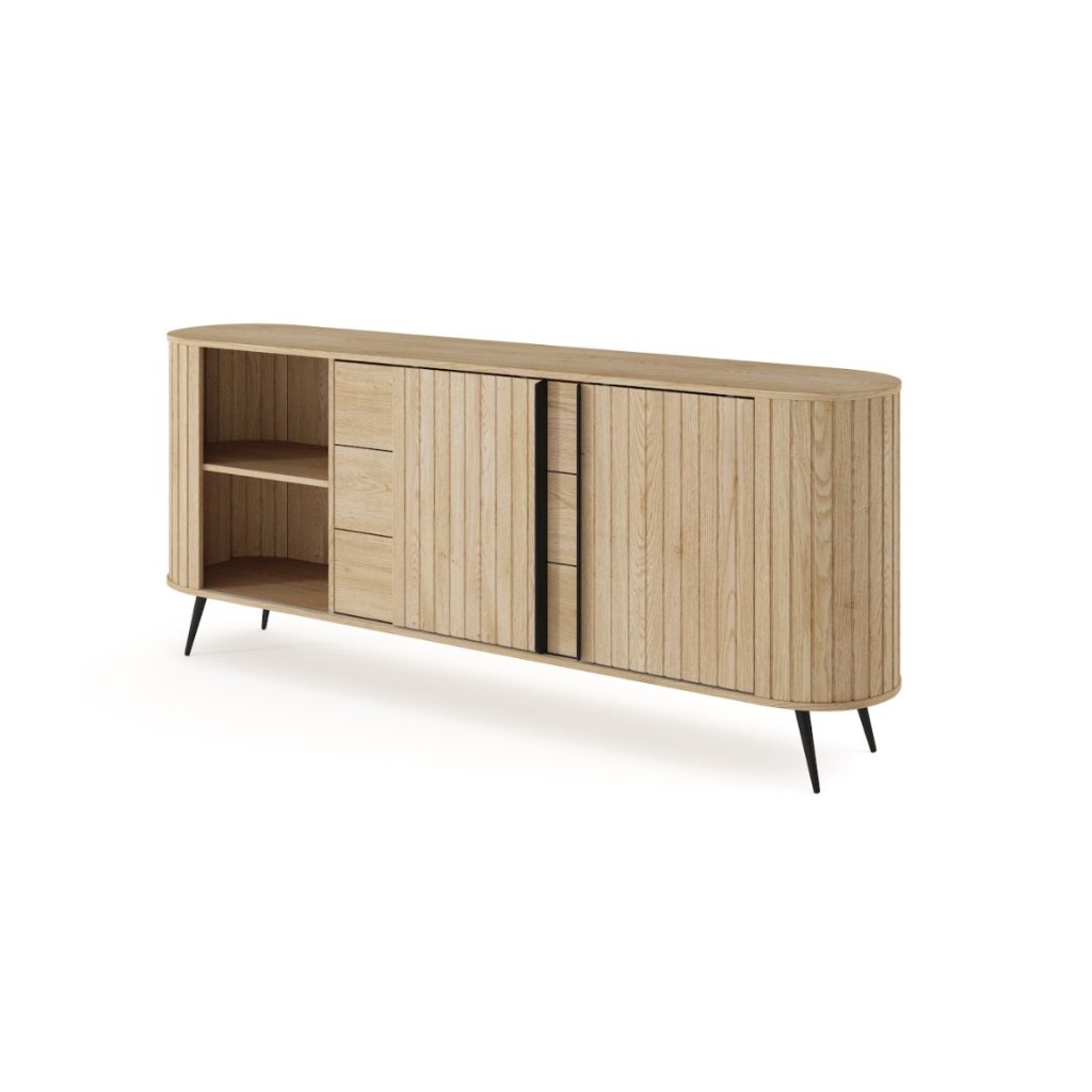 Praktikus, ugyanakkor rendkívül stílusos és eredeti, a LOVLI kollekció lehetővé teszi, hogy kivételes, harmonikusan összehangolt teret teremtsen. A cremonai tölgy lágy, természetes árnyalatai feldobják a belső tereket, és természetességet, frissességet kölcsönöznek nekik . Ami azonban leginkább lenyűgözi ebben a kollekcióban, az a jellegzetes formák, a lekerekített oldalak és a barázdált tolóajtók , amelyek egyedi stílust kölcsönöznek neki. A LOVLI étkező összbenyomása... A fiókokat elegánsan kiegészítik a fém lábak és a fekete fogantyúk. A bútor NYOMÁSSAL NYITHATÓ fiókokkal rendelkezik.