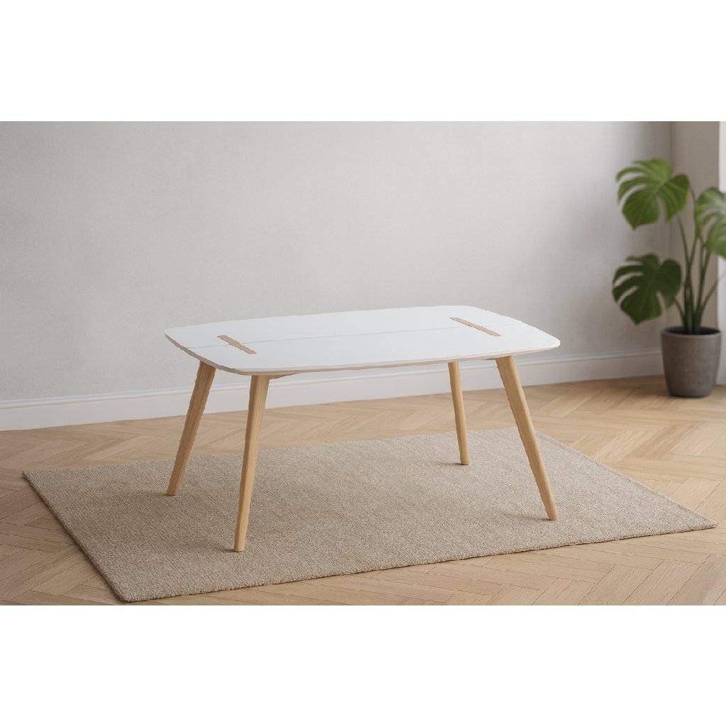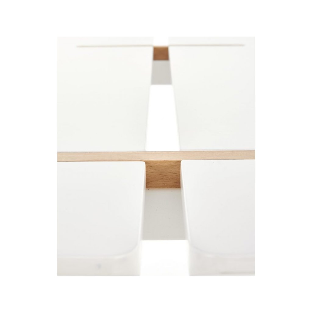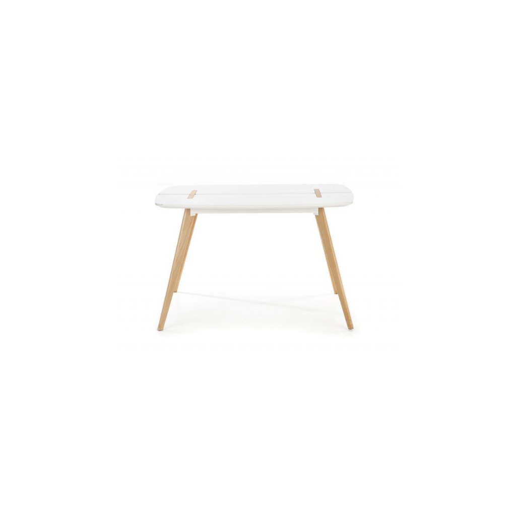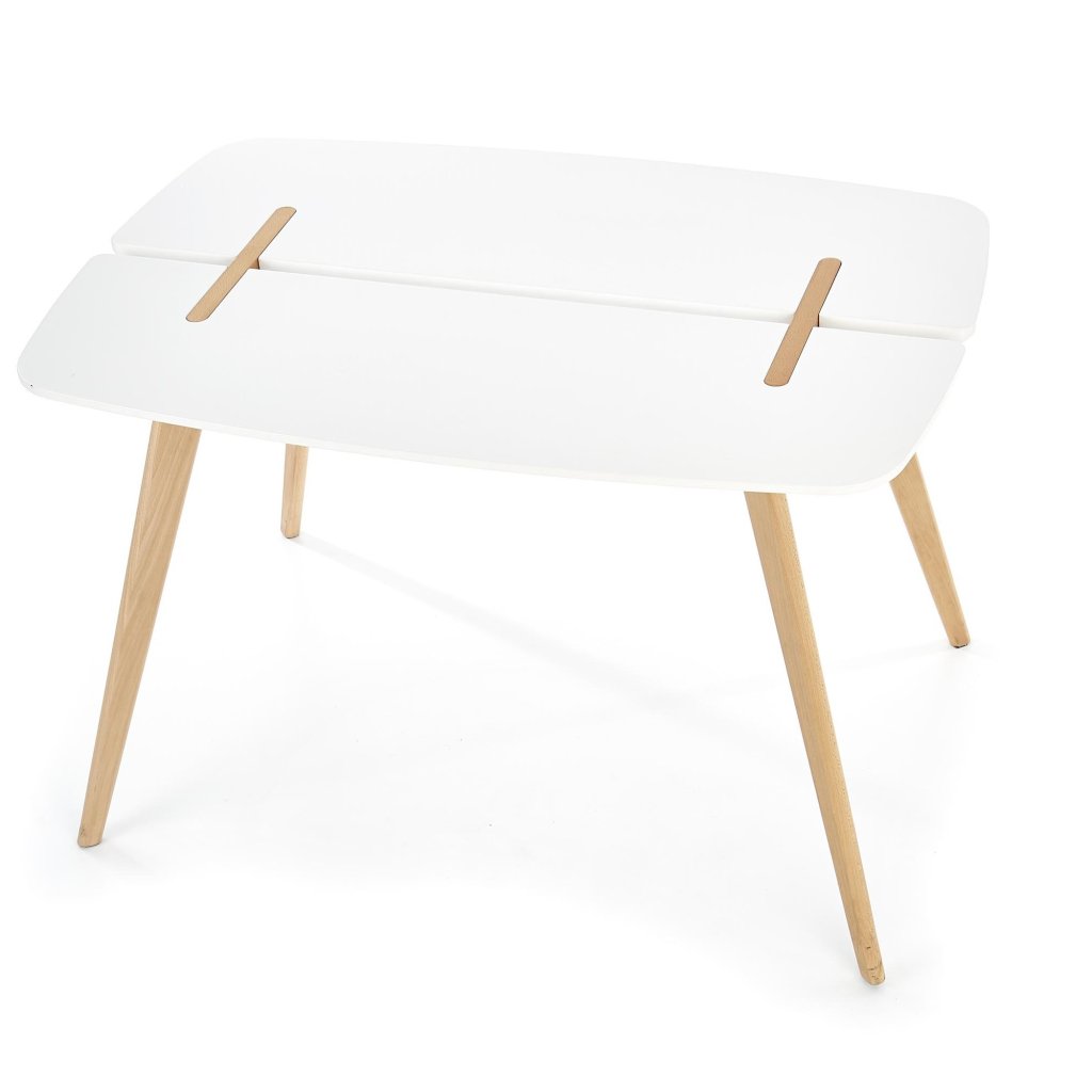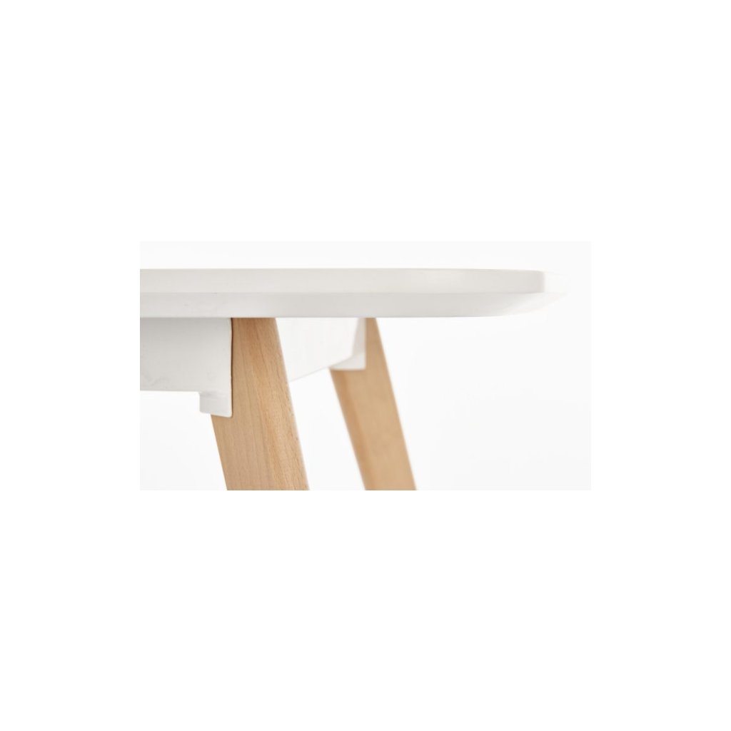 A különleges Davide étkezőasztal elbűvöli a modern és a klasszikus dizájn szerelmeseit. A fehér és a natúr bükk színek kellemes kombinációjával nemcsak praktikus, hanem dizájndarabja is lesz otthonának. A középső rész érdekes díszítése még több eredetiséget és egyediséget kölcsönöz az asztalnak. A fehérre lakkozott, kiváló minőségű MDF-nek köszönhetően az asztallap mindig könnyen karbantartható. Az asztal masszív szerkezetét bükkfa lábak biztosítják.