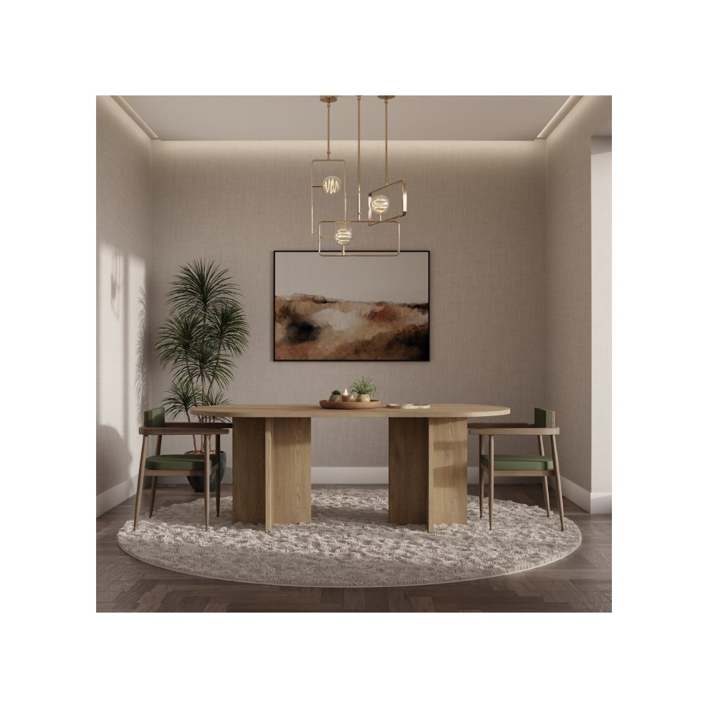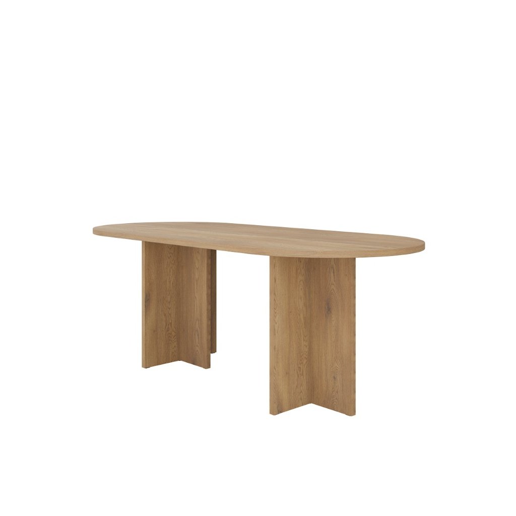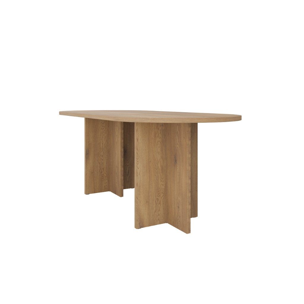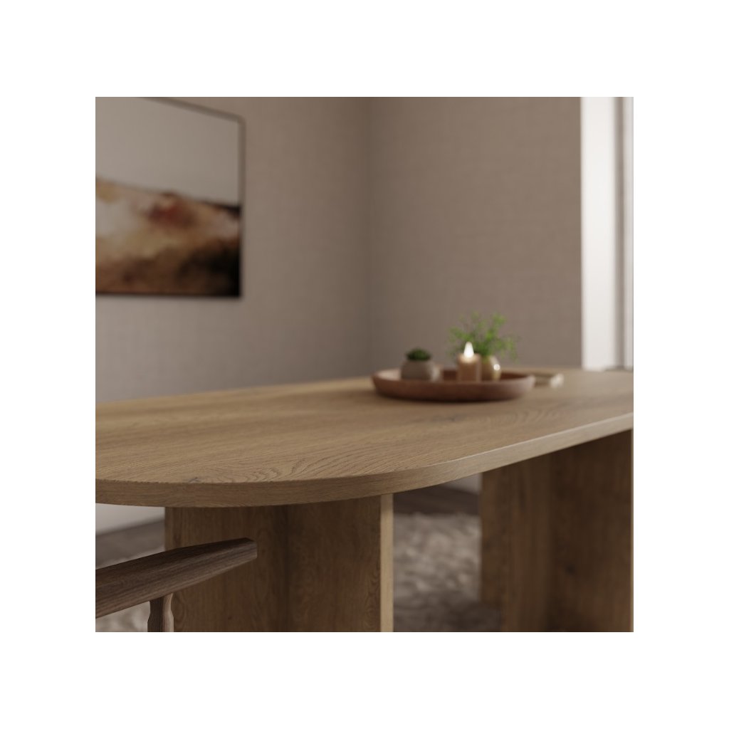 Az OLEN étkezőasztal cremona tölgy színű , nem kihúzható ovális alakú, modern, loft és skandináv stílusban készült. Kényelmes étkezést biztosít 6-8 fő számára, és méreteinek köszönhetően a háztartás természetes fókuszpontját képezi. Az étkezőasztal ideális egy nagyobb étkezőbe vagy étkezővel egybeépített nappaliba. Készen áll a mindennapi használatra és családi összejövetelekre. Az asztal ovális alakja megkönnyíti a kommunikációt az asztalnál ülők között, kiküszöböli az éles sarkokat, ami növeli a biztonságot, különösen a gyermekes háztartásokban, és ugyanakkor optikailag lágyítja a teret a nagyobb helyiségekben .