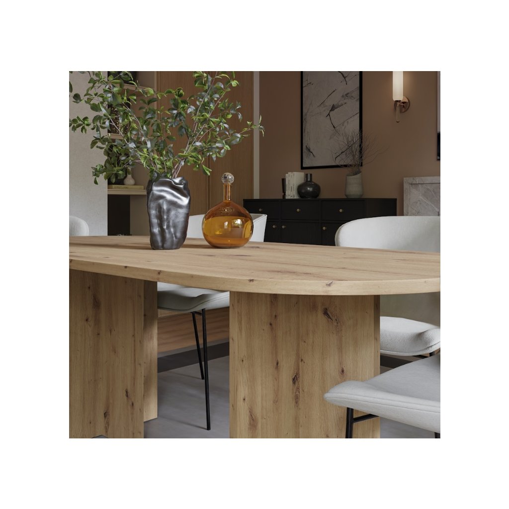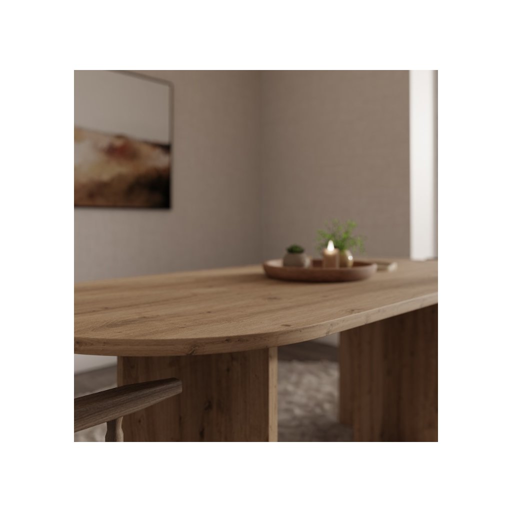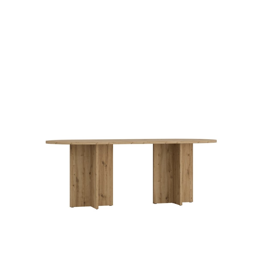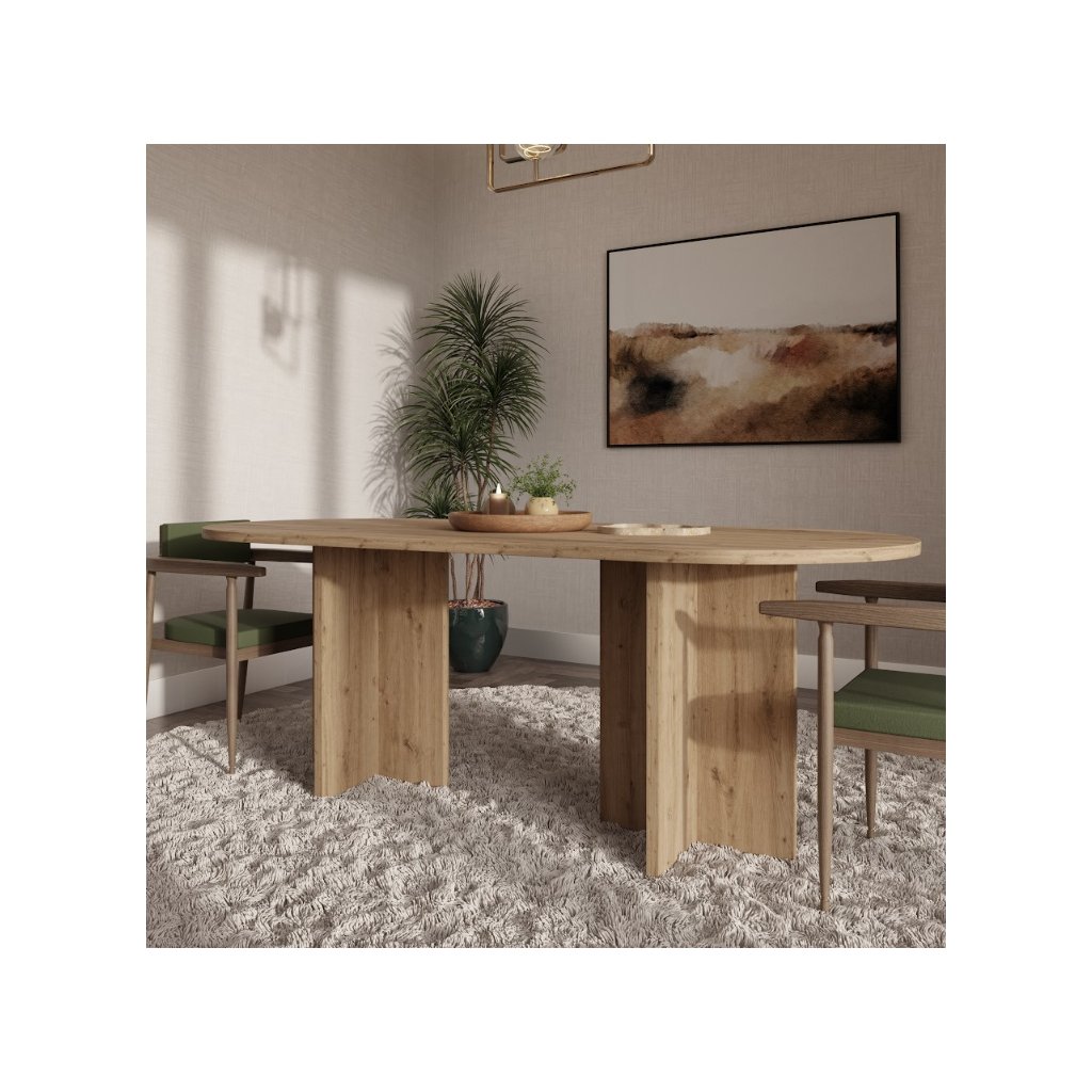 Az OLEN étkezőasztal artisan tölgy színben , nem kihúzható ovális alakú, modern, loft és skandináv stílusban készült. Kényelmes étkezést biztosít 6-8 fő számára, és méreteinek köszönhetően a háztartás természetes fókuszpontját képezi. Az étkezőasztal ideális egy nagyobb étkezőbe vagy étkezővel egybeépített nappaliba. Készen áll a mindennapi használatra és családi összejövetelekre. Az asztal ovális alakja megkönnyíti a kommunikációt az asztalnál ülők között, kiküszöböli az éles sarkokat, ami növeli a biztonságot, különösen a gyermekes háztartásokban, és ugyanakkor optikailag lágyítja a teret a nagyobb helyiségekben .