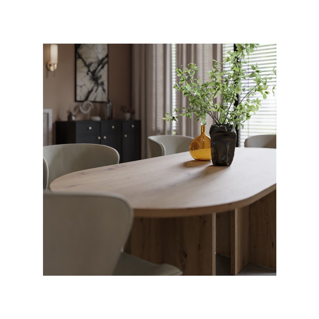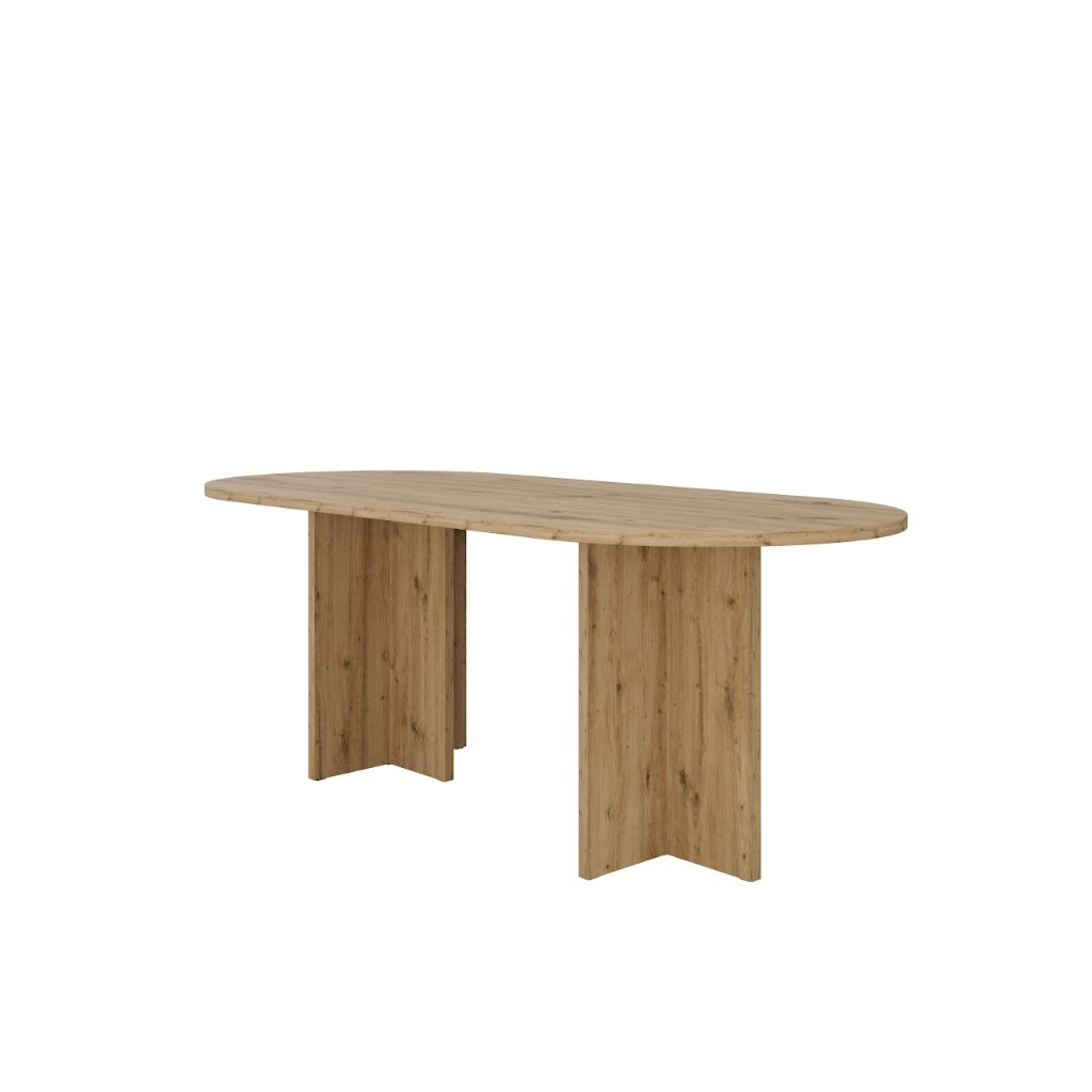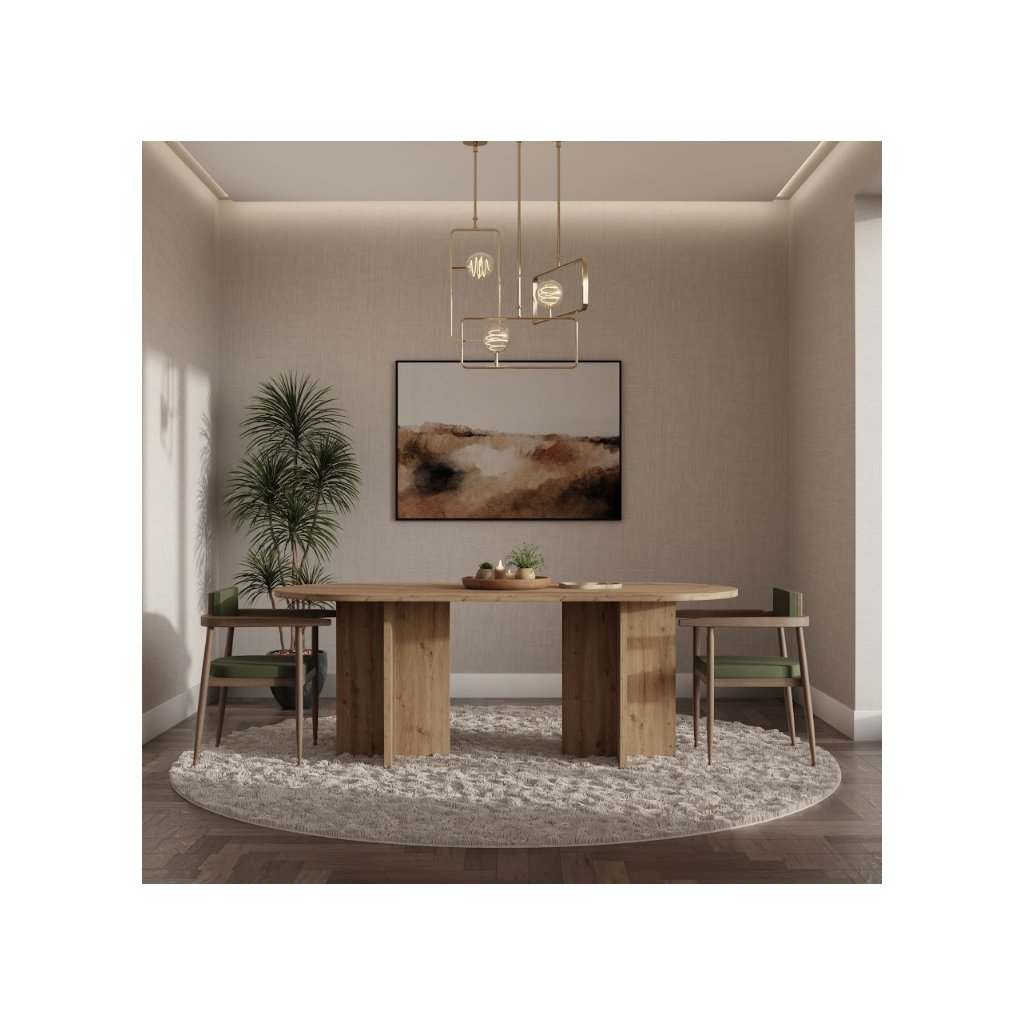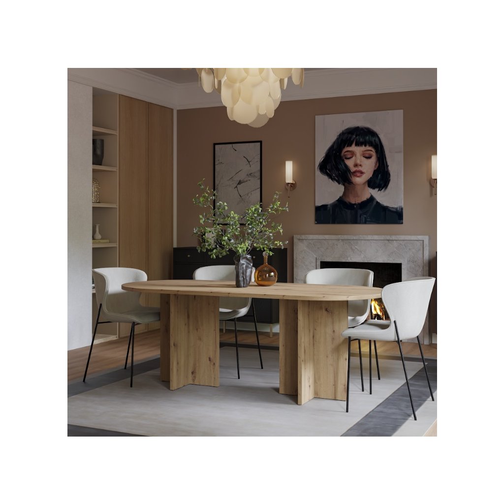 Az OLEN étkezőasztal artisan tölgy színben , nem kihúzható ovális alakú, modern, loft és skandináv stílusban készült. Kényelmes étkezést biztosít 6-8 fő számára, és méreteinek köszönhetően a háztartás természetes fókuszpontját képezi. Az étkezőasztal ideális egy nagyobb étkezőbe vagy étkezővel egybeépített nappaliba. Készen áll a mindennapi használatra és családi összejövetelekre. Az asztal ovális alakja megkönnyíti a kommunikációt az asztalnál ülők között, kiküszöböli az éles sarkokat, ami növeli a biztonságot, különösen a gyermekes háztartásokban, és ugyanakkor optikailag lágyítja a teret a nagyobb helyiségekben .
