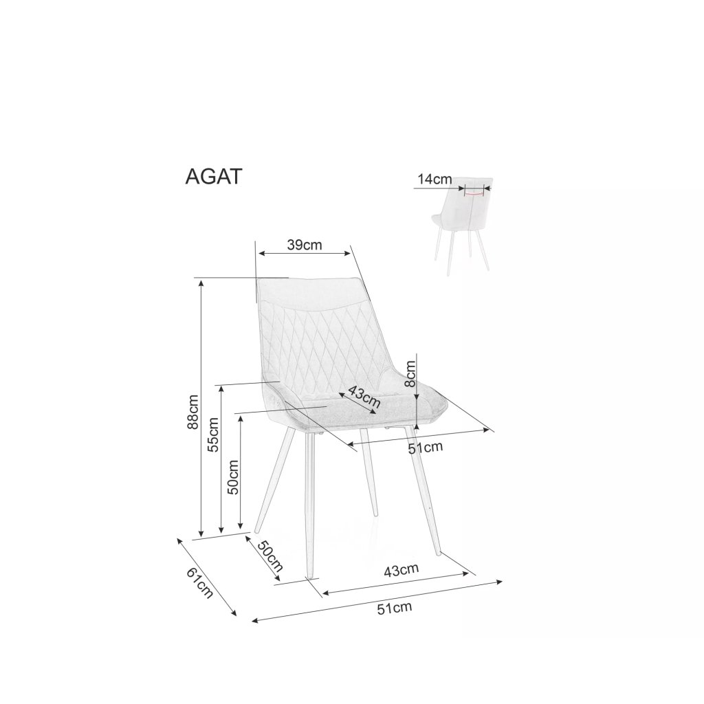 Egyedi kialakításának és tökéletes megjelenésének köszönhetően az AGAT étkezőszék nem hiányozhat egyetlen modern otthonból sem. A szék oldaltámaszok nélküli, így ülés közben korlátlan szabadságot kínál. A szék nemcsak kényelmes ülést, hanem kiváló minőségű fém lábakat és bársonyszövetet is kínál, rendkívüli kialakításban.