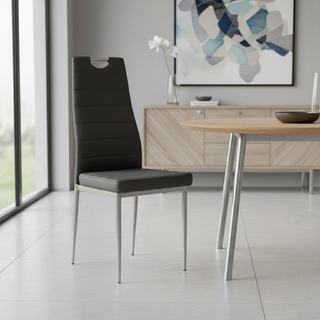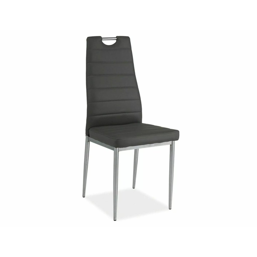 Eredeti étkezőszék H-260 | A szürke különleges kialakításának és praktikus színvilágának köszönhetően bármilyen étkezőbe vagy konyhába alkalmas. Az ülés és a háttámla ekobőrrel borított, és szépen kiegészíti a krómozott fémszerkezet. A szék úgy készült, hogy a legnagyobb kényelmet és kényelmet biztosítsa a teljes ülésidő alatt.